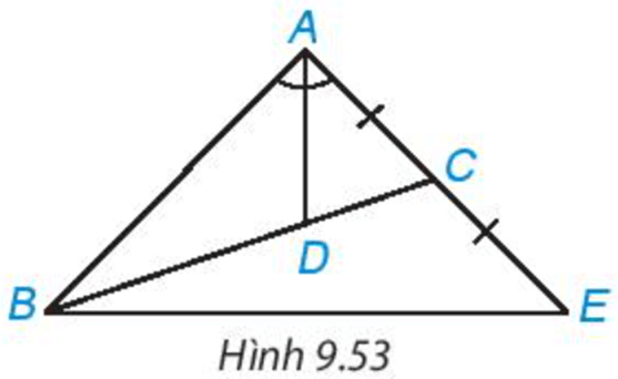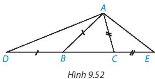 Cho tam giác $ABC (AB > AC)$. Trên đường thẳng chứa cạnh $BC$, lấy điểm $D$ và điểm $E$ sao cho $B$ nằm giữa $D$ và $C$, $C$ nằm giữa $B$ và $E$, $BD = BA, CE = CA$ (H.9.52).