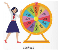 Một bánh xe hình tròn được chia thành $12$ hình quạt như nhau, trong đó có $2$ hình quạt ghi $100$ điểm, $2$ hình quạt ghi $200$ điểm, $2$ hình quạt ghi $300$ điểm, $2$ hình quạt ghi $400$ điểm, $1$ hình quạt ghi $500$ điểm, $2$ hình quạt ghi $1 \,000$ điểm, $1$ hình quạt ghi $2 \,000$ điểm (H.8.3). Ở mỗi lượt, người chơi quay bánh xe. Mũi tên cố định gắn trên vành bánh xe dừng ở hình quạt nào thì người chơi nhận được số điểm ghi trên hình quạt đó.