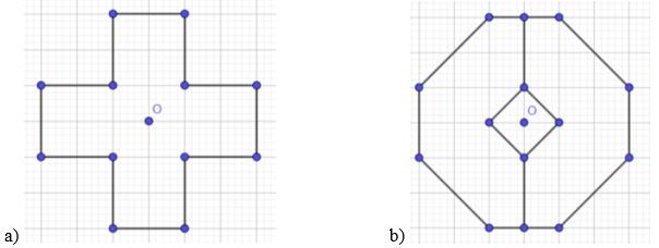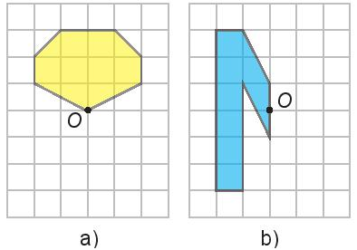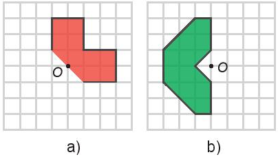 Vẽ lại các hình sau vào giấy kẻ ô vuông rồi vẽ thêm để được một hình nhận điểm O là tâm đối xứng.