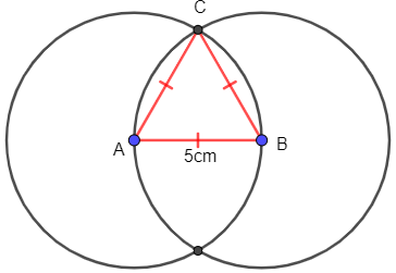 – Hai đường tròn cắt nhau ở C, ta được tam giác đều ABC cạnh 5 cm.