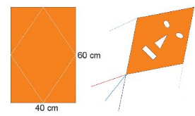 Để làm một con diều, bạn Nam lấy một tờ giấy hình chữ nhật có chiều dài 60 cm, chiều rộng 40 cm để cắt thành một hình thoi như hình bên dưới. Hãy tính diện tích của con diều.