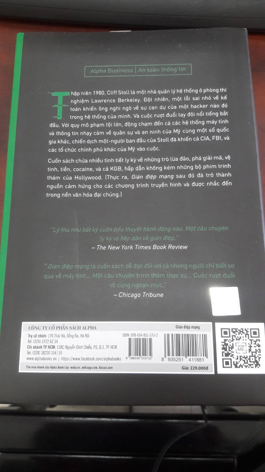 Sách Gián Điệp Mạng, Tác giả: Clifford Stoll, Công ty phát hành Alphabooks Ngày xuất bản 01-2018 Kích thước 16 x 24 cm Dịch Giả Lê Vũ Kỳ Nam Loại bìa Bìa mềm Số trang 516 SKU 4001440407349 Nhà xuất bản Nhà Xuất Bản Công Thương.