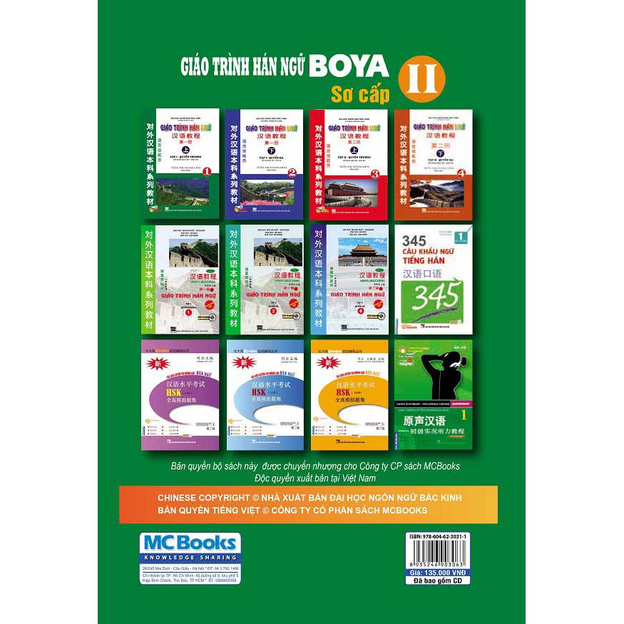 Công ty phát hành MCBOOKS Tác giả Nhiều Tác Giả Ngày xuất bản 08-2016 Kích thước 19 x 27 cm Nhà xuất bản Nhà Xuất Bản Đại Học Quốc Gia Hà Nội Loại bìa Bìa mềm Số trang 227 Lưu ý Sách không còn kèm CD mà thay bằng ứng dụng trên điện thoại SKU 2395967015777 Giáo Trình Hán Ngữ Boya Sơ Cấp II Quyển sách này thuộc trình độ sơ cấp – nằm trong bộ giáo trình “Hán ngữ Boya” bộ sách này cung cấp cho học sinh một lượng kiến thức cơ bản và các hạng ngữ pháp sơ cấp. Lượng kiến thức tron sách giúp học sinh có thể nâng cao trình độ một cách nhanh chóng như tăng vốn lượng từ, củng cố tri thức, dùng ngữ pháp hiểu sâu hơn về văn hóa xã hội Trung Quốc, trau dồi kĩ năng giao tiếp. Cuốn sách bồi dưỡng kĩ năng đọc viết cho học sinh, qua đó học sinh còn tích lũy được nhiều tri thức văn hóa Hán ngữ. Mỗi bài học được chia ra các đơn nguyên. Mỗi đơn nguyên bao gồm các bài. Trước đơn nguyên có phần luyện, sau đơn nguyên là bài tập. Hoạt động luyện tập, đơn nguyên có hình thức đa dạng, mục đích giúp học sinh nhớ lại tri thức ngôn ngữ đã có hoặc chuẩn bị cho việc học đơn nguyên mới. Nội dung bài học trong mỗi đơn nguyên có liên quan với nhau. Mỗi bài đều có từ mới bài khóa, điểm ngôn ngữ và bài tập tương ứng. Về từ mới cung cấp cho học sinh từ tính, phiên âm và nghĩa tiếng Anh, một số từ còn giải nghĩa bằng tiếng Hán, vận dụng nhiều thi phạm phong ogys. Luyện tập từ mới chủ yếu giúp học sinh xây dựng được mối quan hệ hình âm và nghĩa trong chữ Hán. Đối tượng bài tập chủ yếu là từ trọng điểm. Bài khóa của mỗi đơn nguyên đều đi kèm bài tập, mục đích là hướng dẫn học sinh trước hết là hiểu nội dung bài khóa, tập trung chú ý vào ý nghĩa của nó, tiến tới chú ý vào hình thức ngôn ngữ. Ngoài bài tập về nội dung bài khóa còn cung cấp cho học sinh luyện tập giao tiếp trong tình huống thực tế của mình, để hộc ính liên hệ được giữa nội dung bài khóa với cuộc sống hiện thực. Trọng điểm ngôn ngữ của các bài bao gồm ba phần: – Giải thích giản yếu – Câu ví dụ – Bài tập. #sachhanngu #giaotrinhhanngu #giaotrinhtronbo #hanngu #tap1 #phienbanmoi #tuhoc #tiengtrung #HSK #hanngumoi #sach #giaotrinhhanngutap1 #ngoaingu #sachhoc #giaotrinhhanngutap1quyenthuong #giaotrinhhannguphienbanmoi #hanngu1 #tronbogiaotrinhhanngu