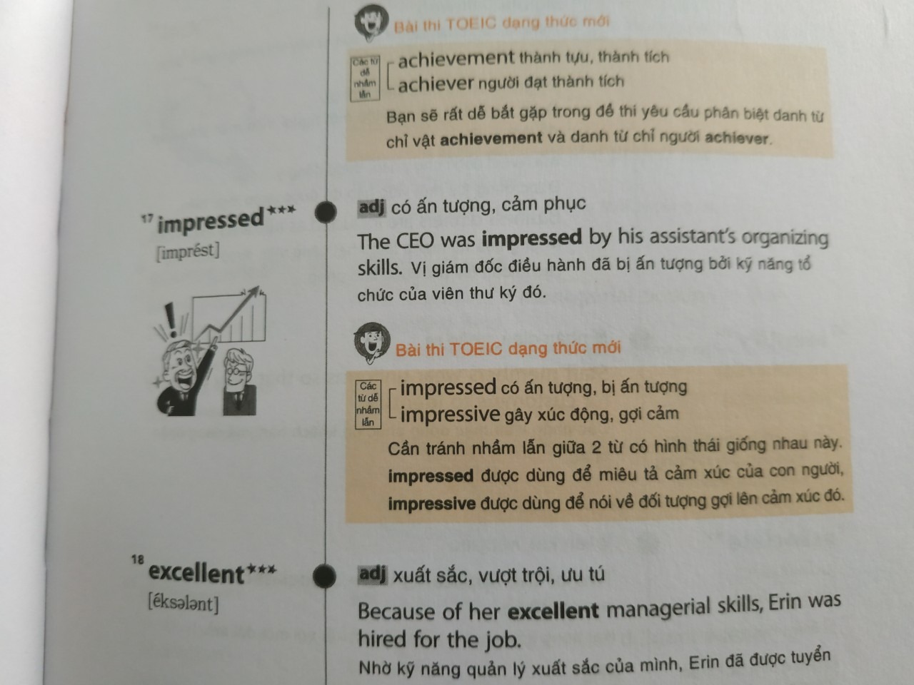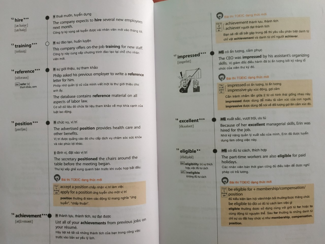 Hackers TOEIC Vocabulary là cuốn sách được thiết kế nhằm giúp người học có thể hoàn thành mục tiêu nhớ và nắm được cách sử dụng của khoảng gần 7600 từ vựng theo các chủ đề khác nhau trong vòng 30 ngày. Ngoài ra, bạn còn được cung cấp những nội dung cần thiết liên quan như: câu hỏi theo định dạng bài thi thật, các xu hướng ra đề của bài thi dạng thức mới. “120 thành ngữ và cụm từ cố định cần biết để chinh phục bài thi TOEIC” ở cuối sách cũng là một nguồn tài liệu quý giá khiến cho các câu hỏi trong bài thi TOEIC không thể làm khó bạn trên con đường chinh phục điểm số mơ ước. Hackers TOEIC Vocabulary bao quát những nội dung phù hợp với nhiều đối tượng khác nhau, từ người mới tiếp cận đến người đã rất quen thuộc với bài thi TOEIC, thông qua cách thiết kế nội dung hợp lý với Từ vựng TOEIC cơ bản, Từ vựng TOEIC mức 800 điểm, Từ vựng TOEIC mức 900 điểm. Hãy xác định mục tiêu điểm số của mình và tập trung trau dồi vốn từ vựng cần thiết để đạt được mục tiêu đó nhanh chóng và hiệu quả nhất. Chinh phục từ vựng TOEIC trong vòng 30 ngày: Cuốn sách được biên soạn nhằm giúp người học có thể nắm vững những từ vựng cần thiết sẽ xuất hiện trong bài thi TOEIC dạng thức mới trong thời gian 30 ngày. Người học có thể làm bài kiểm tra trình độ ở đầu sách để xác định năng lực của bản thân, từ đó có thể lựa chọn lộ trình học phù hợp đề đạt được mục tiêu của mình. Cung cấp một khối lượng lớn từ vựng cùng các ví dụ thường gặp trong bài thi TOEIC: Ngoài việc cung cấp cho người học một khối lượng lớn từ vựng với gần 7600 từ, cuốn sách còn giới thiệu cả những cụm từ quan trọng thường xuất hiện trong bài thi TOEIC và đưa ra các ví dụ cụ thể, sinh động để người học hiểu và ghi nhớ cách sử dụng những từ, cụm từ đó. Bạn không chỉ được cung cấp những từ vựng thường gặp ở Part 5, 6, 7 của phần thi Reading mà còn được học cả những từ có tần suất xuất hiện cao trong phần thi Listening. Nhấn mạnh những nội dung thường gặp trong bài thi TOEIC dạng thức mới: Bạn sẽ liên tục gặp trong sách những nội dung được trình bày nổi bật dưới tiêu đề Bài thi TOEIC dạng thức mới. Đây là những nội dung giúp người học nắm bắt được điểm nhấn và khuynh hướng xuất hiện của các từ vựng trong đề thi. Ngoài ra, sách còn đưa ra những lưu ý về ngữ pháp cũng như những nhầm lẫn mà thí sinh thường mắc phải trong quá trình làm bài thi. Ôn tập hiệu quả trong thời gian ngắn với các nội dung có tỷ lệ xuất hiện cao trong bài thi: Thông qua các ký hiệu ngôi sao và ký hiệu hình tròn màu đen với mỗi từ, cuốn sách giúp người học dễ dàng xác định được tỷ lệ xuất hiện của từ vựng trong bài thi ở mức độ nào cũng như từ vựng nào thường gặp trong Part 5, 6 hay Part 7. Nhờ vậy mà thí sinh có thể định hướng mục tiêu học tập rõ ràng và hiệu quả hơn trong thời gian ngắn. Người học có thể xây dựng được lộ trình học tập theo điểm số mong muốn: Cách thiết kế nội dung hợp lý với việc phân chia thành các phần Từ vựng TOEIC cơ bản, Từ vựng TOEIC mức 800 điểm, Từ vựng TOEIC mức 900 điểm tạo điều kiện cho người học xây dựng được kế hoạch học tập phù hợp với khả năng và mục tiêu điểm số của mình. Học từ vựng theo chủ đề giúp việc học tập có trọng tâm hơn và hiệu quả hơn: Cuốn sách chia các từ vựng thành 30 chủ đề khác nhau tương ứng với 30 ngày học. Mỗi bài học luôn bắt đầu bằng một mẩu truyện tranh ngắn hài hước, thú vị; tiếp đó là các từ vựng đi kèm với những ví dụ cụ thể có liên quan đến chủ đề của bài. Người học nhờ đó sẽ nhớ từ tốt hơn, nắm được cách sử dụng của từ và cụm từ và cũng mở rộng được được vốn hiểu biết của mình trong lĩnh vực có liên quan. Chuẩn bị hoàn hảo nhất cho bài thi TOEIC với 120 thành ngữ và cụm từ cố định cần biết: Trong bài thi TOEIC dạng thức mới, thí sinh sẽ thường xuyên gặp ở Part 3, 4 và 7 các thành ngữ và cụm từ cố định mà nếu chưa gặp qua lần nào, bạn sẽ rất dễ hiểu nhầm nghĩa của chúng. Bảng liệt kê 120 thành ngữ và cụm từ cố định cần biết sẽ giúp người học chuẩn bị tốt nhất cho phần thi của mình. Các cụm câu hỏi bám sát với bài thi thật của TOEIC dạng thức mới: Cứ sau 10 bài học, cuốn sách lại cung cấp cho người học một phần luyện tập với cụm 13 câu hỏi có hình thức giống với câu hỏi trong bài thi thật. Thí sinh có thể thử sức mình và tự đánh giá khả năng của bản thân bằng cách đối chiếu với phần đáp án và giải thích tỉ mỉ ở cuối sách.