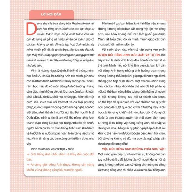 Công ty phát hành MCBOOKS Tác giả Hoàng Ngọc Quỳnh Ngày xuất bản 01-2018 Kích thước 20.5 x 23 cm Nhà xuất bản Nhà Xuất Bản Hồng Đức Loại bìa Bìa mềm Số trang 312 GIỚI THIỆU SÁCH Hacking Your English Speaking – Luyện Nói Tiếng Anh Đột Phá Chương 1: Động lực học tiếng Anh Chương 2: IPA Chart (International Phonetic Alphabet) – Bảng ký tự phiên âm Quốc tế Chương 3: Stop thinking, Start Speaking. Học và sử dụng ngay các từ, cụm từ và cấu trúc câu thông dụng trong tiếng Anh nói. Luyện nói phản xạ tự động sử dụng sơ đồ tư duy sinh động và các câu minh họa đơn giản. Qua Chương 3, bạn sẽ học được tối thiểu 50 cấu trúc nói (speaking pattern) thông dụng, 500 từ và cụm từ tiếng Anh giao tiếp hay gặp nhất. Chương 4: Real English. 50 hội thoại tiếng Anh thông dụng nhất qua 4 bước thực hành sẽ giúp bạn phản xạ nói tiếng Anh được trong hầu hết các tình huống giao tiếp thông dụng. Bằng phương pháp ghi nhớ từ vựng qua ngữ cảnh, nghe nói phản xạ qua nghe audio và sử dụng sơ đồ hội thoại, nghe và bắt chước, cùng các language notes chi tiết, bạn sẽ có thể giao tiếp được trong hầu hết mọi tình huống thông dụng nhất. Chương 4 sẽ có audio đi kèm để sử dụng cho việc luyện nghe nói phản xạ..