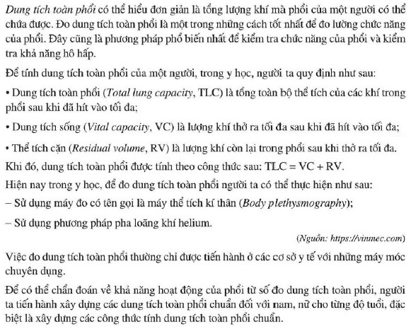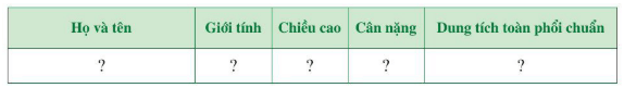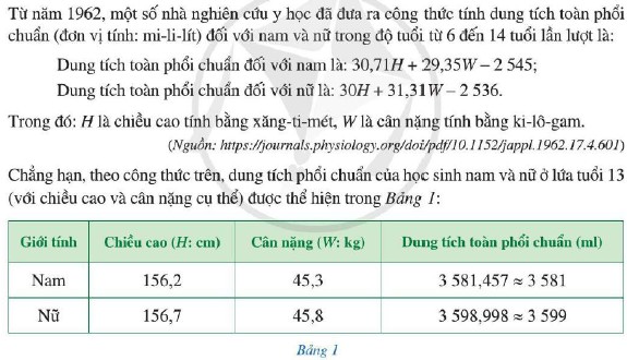 Sử dụng công thức đã nêu, từng học sinh tính dung tích toàn phổi chuẩn của mình, người thân trong gia đình ở độ tuổi từ 6 đến 14 tuổi (nếu điều kiện cho phép).