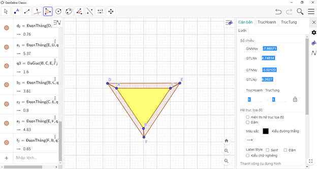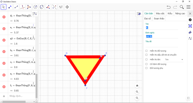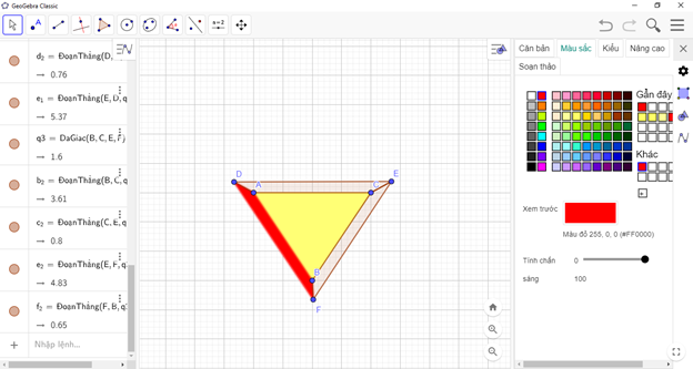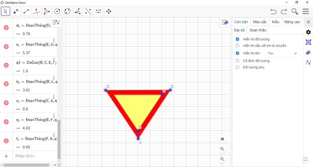 ♦ Bước 4. Tiếp tục vẽ tam giác đều DEF và tùy chỉnh bằng cách kéo chuột sao cho được hình như hình dưới:
