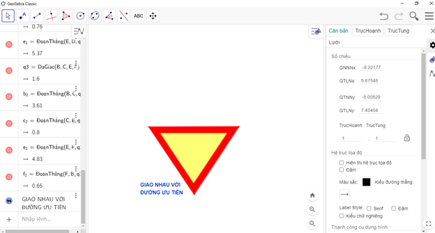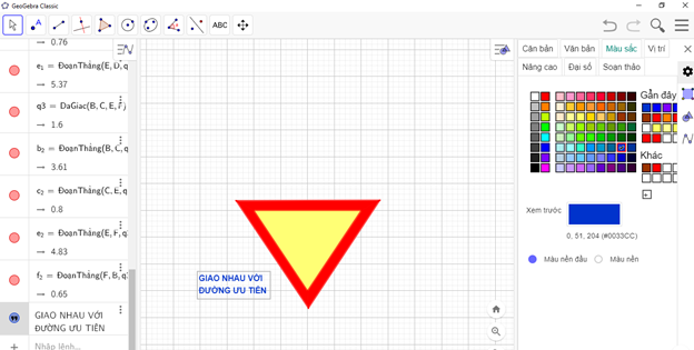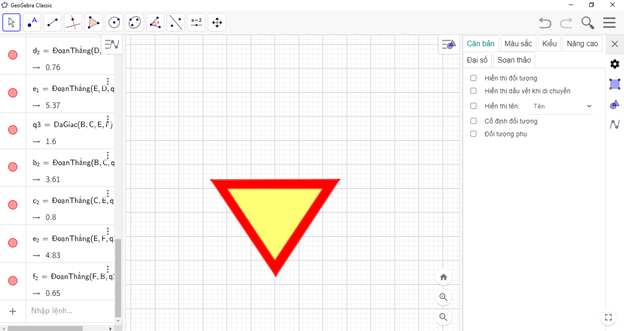 Quan sát hình biển báo, ta thấy đây là hình 1 tam giác đều với màu vàng trong và viền đỏ bên ngoài. Vậy ta sẽ thực hiện vẽ như sau: