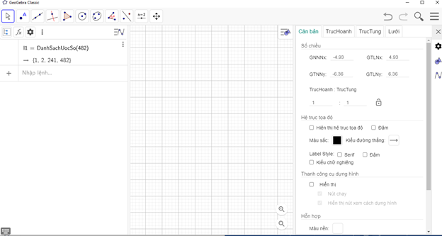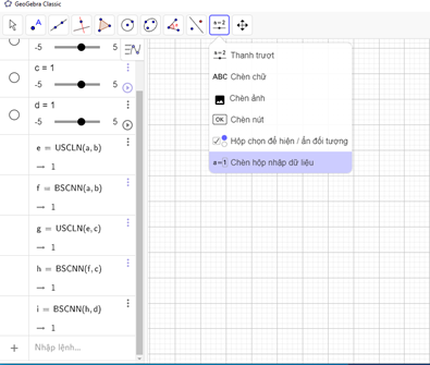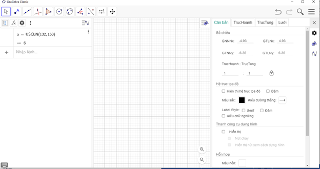 – Nhập lệnh “USCLN(a,b)” để tạo ra số e là ước chung lớn nhất của hai số a và b.