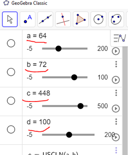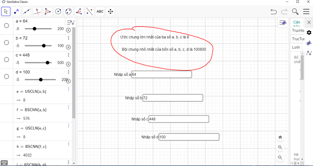 – Nhập các số vào ô lệnh ở các vị trí a, b, c, d theo thứ tự các số a = 64, b = 72, c = 448, d = 100. (Thay các số a = 1, b = 1, c = 1, d = 1 bàng đầu bằng các số a = 64, b = 72, c = 448, d = 100 trên hộp nhập lệnh như hình vẽ dưới).