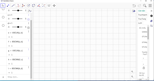 – Nhập lệnh “USCLN(e,c)” để tạo ra số g là ước chung lớn nhất của ba số a, b, c.