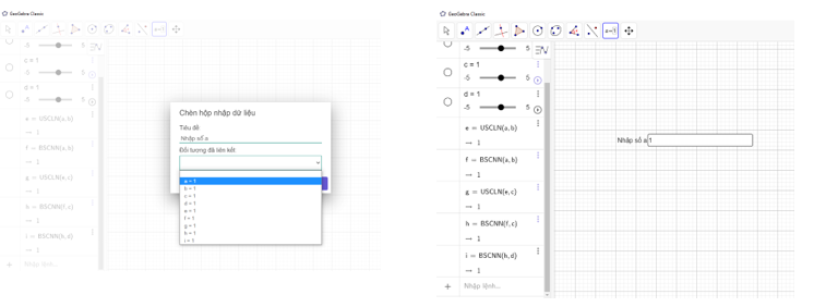 – Dùng lệnh “Chèn hộp nhập dữ liệu” (như hình trên) để tạo hộp chọn đầu vào và đặt tên là “Nhập số a” rồi tạo liên kết với a.