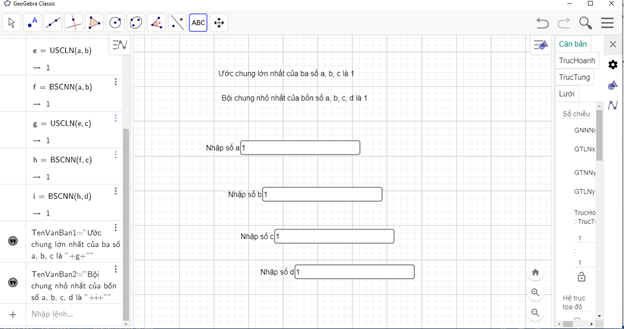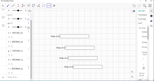 – Nhập lệnh “BSCNN(h,d)” để tạo ra số i là bội chung nhỏ nhất của bốn số a, b, c, d.