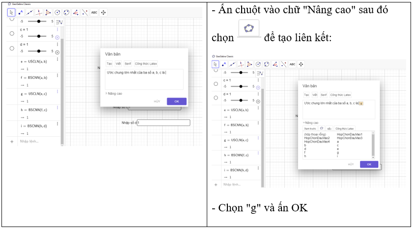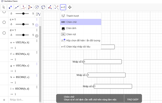 – Dùng lệnh “Chèn chữ” (như hình trên) nhập vào “Ước chung lớn nhất của ba số a, b, c là” rồi tạo liên kết với g.