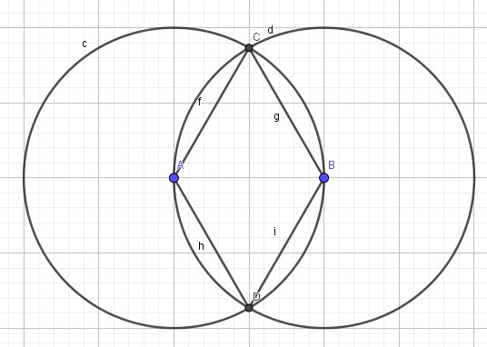 Sử dụng thước thẳng ta thấy AC = CB = BD = AD. Vậy hình còn lại trên vùng làm việc là hình thoi ACBD.