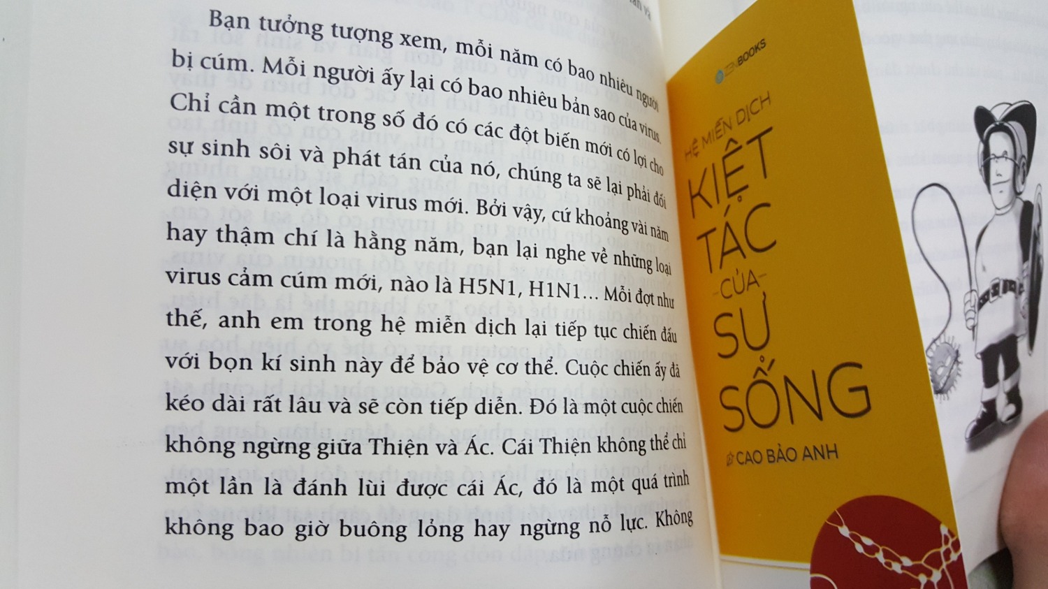 Ta không chỉ là thân xác của ta, hay chính xác hơn, cái thân xác này sinh ra để phục vụ cho sự tồn tại của ta! Chà, nghe thật là triết học, nhưng bạn có thể hiểu đơn giản là: Chúng ta có tâm hồn và lý trí, và thân xác thực ra là một tải thể chứa hai phần đó Như thế, chúng ta vừa chạm đến một điều sâu sắc hơn: Chúng ta đích thực là tâm hồn và lý trí, còn cái thân thể đang nhìn chằm chằm vào những dòng chữ của cuốn sách này là ngôi-nhà của chúng ta Như thế, một vấn đề đặt ra là: Nếu chúng ta không hiểu gì về ngôi-nhà thân xác đang bao chứa mình, chúng ta sẽ không hiểu được gì về chính ta Nói rõ hơn là thế này: Ta buộc phải hiểu những gì đang chi phối mình, sau cùng ta mới biết được mình đích thực là ai! Cuốn sách này chính là chìa khóa dẫn lý trí và tâm hồn của bạn đến với thế giới của thân xác, cho bạn chiêm ngưỡng bản thiết kế tế bào vô cùng phức tạp, và kể với bạn sử thi oai hùng của HỆ MIỄN DỊCH – KIỆT TÁC CỦA SỰ SỐNG Đây chính là bước chân đầu tiên trên hành trình vạn dặm để bạn thật hiểu chính mình và đích thực hạnh phúc! **** VỀ TÁC GIẢ CAO BẢO ANH (CẨM TÚ TRƯỜNG) – OOPSY Tác giả Cao Bảo Anh (bút danh Cẩm Tú Trường, tác giả Cộng đồng tâm lý OOPSY). Hiện anh là Nghiên Cứu Sinh Tiến sĩ chuyên ngành Miễn dịch học, Đại học Havard, Mỹ. Anh là tác giả của nhiều bài báo khoa học xuất sắc đã xuất bản tại Mỹ. Trợ giảng bộ môn Miễn Dịch và Hóa Sinh tại Đại học Havard và Đại Học Toronto. Với nền tảng chuyên môn sâu về hệ miễn dịch, được đào tạo từ những trường đại học hàng đầu và niềm đam mê tri thức, nhiệt huyết lan truyền giá trị và tài năng của mình, tác giả Cẩm Tú Trường đã biến những kiến thức tưởng như khô khan trở thành một câu chuyện thú vị đầy sống động mang đến cho chúng ta một cuốn sách hấp dẫn chưa từng có về y học, về hệ miễn dịch Trong sách không chỉ là tri thức mà là cả sự sống, cả tấm lòng muốn khơi dậy ý chí sống trong mỗi chúng ta “Tôi viết cuốn sách này vào lúc tuổi thanh xuân sắp qua đi, khi mà hệ miễn dịch vẫn đang hoạt động mạnh mẽ nhất. Tôi lắng nghe câu chuyện của chúng, ghi chép ra và dành tặng nó cho bạn Có nhiều người cho rằng, thân thể chỉ gồm những bộ phận vô tri, được nuôi bằng máu và sống cộng sinh với vi khuẩn. Thế là họ cũng chẳng hiểu gì về chính mình, cứ mơ hồ và quẩn quanh ngay cả khi bận rộn tối ngày Bởi với thân thể mình còn bất minh, thì có gì là rõ ràng được chứ! Nhìn vào hệ miễn dịch – một trong những hệ thống được thiết kế công phu nhất cơ thể – có thể giúp chúng ta hiểu biết về chính mình theo một cách kì diệu mà chúng ta không tưởng tượng nổi đâu Hãy dõi theo từng trang sử thi oai hùng của “những người anh em siêng năng” trong hệ miễn dịch, để lúc đọc xong, bạn sẽ thấu hiểu Thân mình và tự nhủ: “Ôi, tôi yêu mình biết bao!” *** LỜI KHUYÊN CỦA BIÊN TẬP VIÊN CHO VIỆC ĐỌC CUỐN SÁCH Hãy đọc nó như theo dõi một bộ phim, hay như đang xem một cuốn sử thi, vì mọi chuyện hoàn toàn không phải là hư cấu đâu. Những người anh em tế bào có thể là một cách gọi nhân hóa nhưng những gì diễn ra là một câu chuyện có thật. Từng sự kiện, diễn biễn trong cơ thể vào mỗi thời khắc sống đều quyết liệt và cam go như thế. Bên dưới vẻ ngoài bình ổn, dưới lớp da trông như là liền lạc và an toàn này luôn là những cuộc chiến, là một hệ thống cực kì tinh vi ngày đêm làm việc để bảo vệ chúng ta. Tôi nghĩ rằng bất kì ai, nếu thật sự chú tâm vào câu chuyện này cũng vô cùng cảm động. Trong khi chúng ta đang vật lộn với những mối quan tâm rất thường ngày nhưng có thể là vô nghĩa lí, thì cơ thể này, hệ miễn dịch này vẫn chuyên chú cho sứ mệnh bảo vệ sự sống, mà nhiều khi mối nguy hiểm lại đến từ chính sự thiếu hiểu biết của con người chứ không phải do đối tượng gây hại nào khác Sau khi đọc xong, bạn sẽ thấu hiểu thân thể mình và tự nhỉ “Ôi, tôi yêu mình biết bao!” – chắc chắn đấy! Tin rằng cuốn sách này sẽ cho bạn thêm động lực để xây dựng một đời sống lành mạnh hơn, trân quý sự sống của bản thân và dùng thời gian sống của mình cho những việc đích đáng Hệ miễn dịch này luôn xứng đáng với ta, còn ta hãy sống cho xứng đáng với món quà đã được ban trao, với những người anh em hệ miễn dịch luôn tận lực cống hiến. Một điều nhất định phải nhớ sau khi đọc xong cuốn sách này: Thân thể là phép màu, hệ miễn dịch là kiệt tác của sự sống. Hãy sống với phép màu của sự thấu hiểu, bạn sẽ có một cuộc đời tuyệt vời, ngược lại, chỉ có sự hủy hoại, tật bệnh không thể cứu vãn – giống như một lời nguyền quái ác. *** NHỮNG TRÍCH ĐOẠN HAY NHẤT Những người mạnh mẽ và tự tin ta gặp ấy mà, thật ra cũng đều đang nén nhịn một nỗi tự ti sâu th