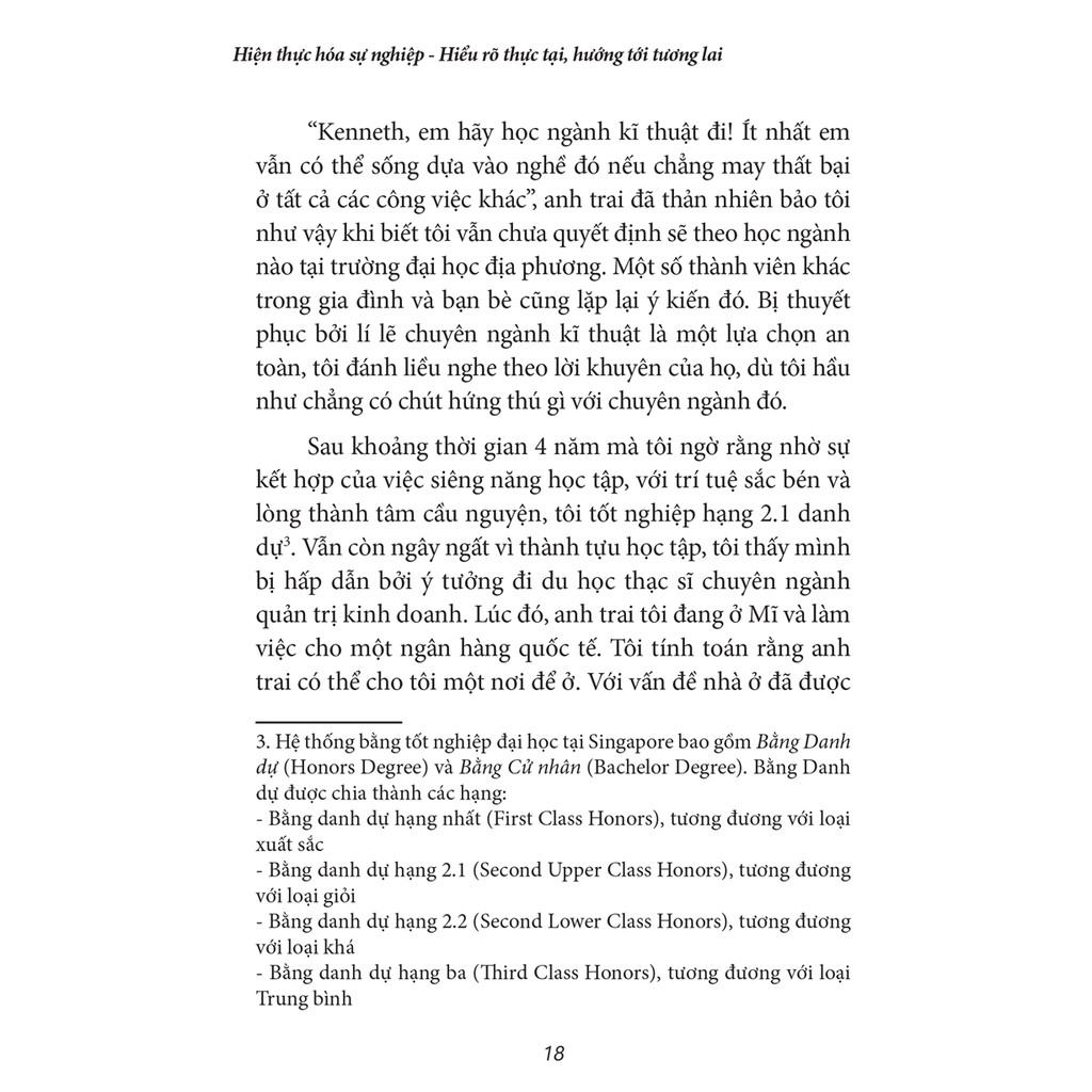 THÔNG TIN CHI TIẾT Công ty phát hành Minh Long Tác giả Kenneth Leow Ngày xuất bản 04-2018 Kích thước 14.5 x 20.5 cm Nhà xuất bản Nhà Xuất Bản Phụ Nữ Loại bìa Bìa cứng Số trang 224 GIỚI THIỆU SÁCH Hiện thực hóa sự nghiệp phiên bản bìa cứng – phiên bản đặc biệt kỉ niệm sinh nhật 10 tuổi của Minh Long Book. “Hãy tự tạo điều kiện thuận lợi cho mình, đừng phó mặc sự nghiệp của bạn cho may rủi”, đó là những câu từ mà Kenneth đã viết trong một cuốn sách sâu sắc và thiết thực một cách tuyệt vời. Khi nói đến sự nghiệp, thực tế là nhiều người trong số chúng ta tin vào may rủi nhiều hơn mức cần thiết. Nó giống như việc chúng ta bước xuống một con thuyền để bắt đầu hành trình sự nghiệp rồi để con thuyền đó trôi nổi một cách vô định. Chúng ta xuôi theo dòng và có thể sẽ dừng chân ở nơi nào đó khiến bản thân hài lòng và thỏa mãn, thậm chí hưng phấn. Nhưng trong nhiều trường hợp, điều đó không xảy ra. Được viết nên từ chính trải nghiệm của Kenneth qua vô số cuộc hội thảo, buổi phỏng vấn và nói chuyện mà anh đã tiến hành, cuốn sách này dạy chúng ta cách “chèo thuyền”, hay nói cách khác là cách để chúng ta kiểm soát hành trình sự nghiệp của mình. Đây là một nhiệm vụ không dễ dàng: có quá nhiều rủi ro, những bất ổn, những ngã rẽ sai lầm, những cạm bẫy và cám dỗ dọc theo đường đi