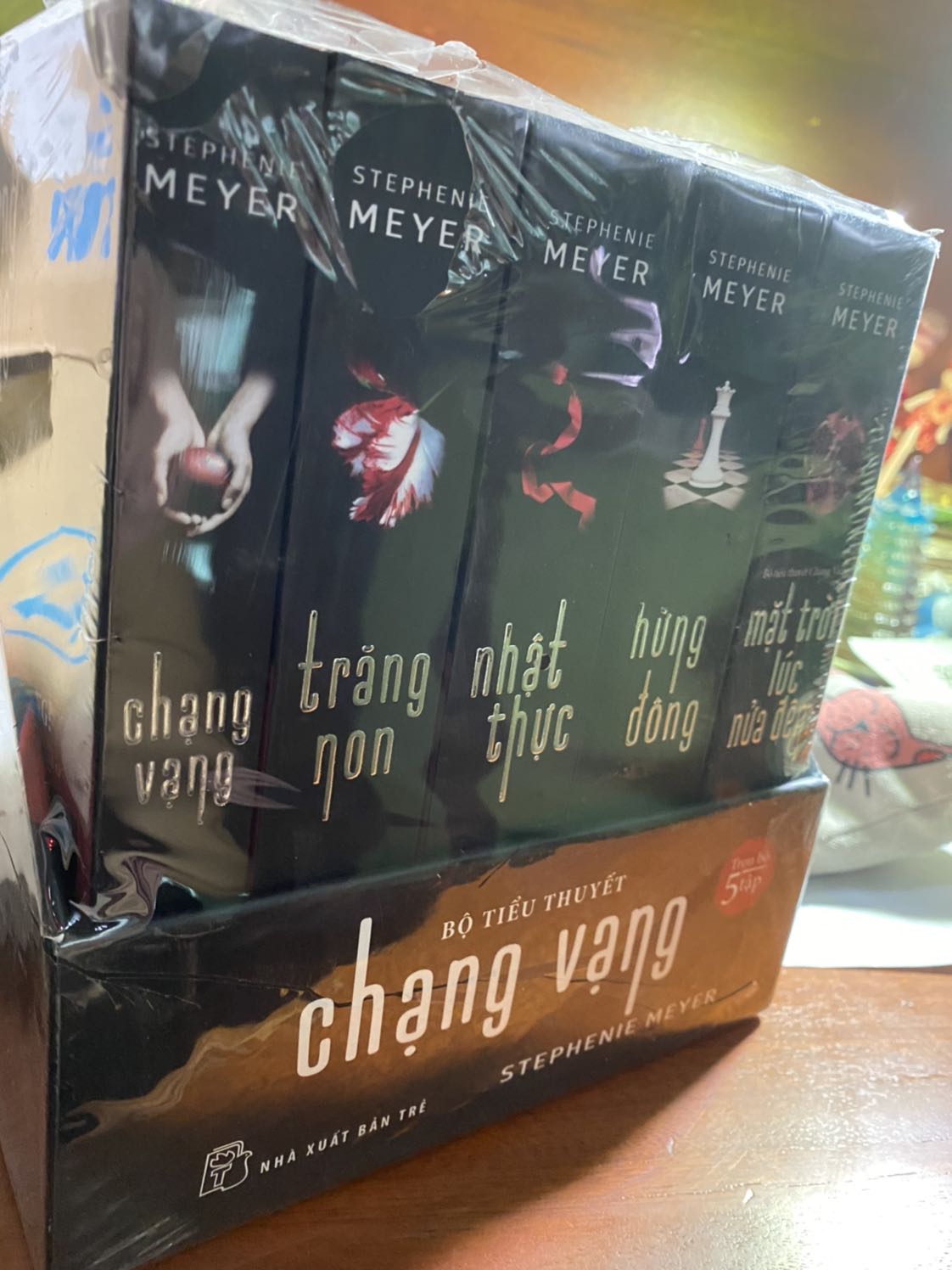 HỘP TRỌN BỘ CHẠNG VẠNG Nhân dịp ra mắt tập sách mới là Mặt trời lúc nửa đêm, Nhà xuất bản Trẻ tái bản lại trọn bộ chạng vạng với hình thức mới, đẹp và sang trọng: bìa ép kim, dập nổi và phủ UV, ruột sách được in bằng giấy Nhật chất lượng cao. Đồng thời, Nhà xuất bản Trẻ phát hành hộp trọn bộ Chạng vạng, dành cho độc giả yêu thích sưu tầm. Hộp Sách bao gồm 5 tập : 1/Chạng vạng 2/Trăng non 3/Nhật thực 4/Hừng đông 5/Mặt trời lúc nửa đêm 1. Chạng vạng Chạng Vạng là tác phẩm đã đẩy Harry Potter 7 ra khỏi vị trí đầu tiên trong bảng xếp hạng best – seller của New York Times trong suốt 28 tuần. “Chưa bao giờ tôi nghĩ nhiều đến việc mình sẽ chết như thế nào – dù rằng trong mấy tháng cuối cùng này, tôi có đủ lý do để nghĩ đến nó – mà dù tôi có nghĩ đến nó thì tôi cũng sẽ không tưởng tượng ra là nó như thế này. Tôi đưa mắt nhìn lướt dọc theo căn phòng dài, nhìn thẳng vào đôi mắt u ám của kẻ săn mồi, nghẹt thở Hắn đáp lại tôi bằng một cái nhìn trìu mến. Tất nhiên đây là một cái chết êm đẹp, một sự hy sinh cho người khác – một người mà tôi vô cùng yêu thương – người rất có ý nghĩa với tôi trong cuộc đời. Phải là như vậy rồi. Tôi hiểu rằng nếu như mình không đến Forks thì bây giờ mình đã không phải đối diện với cái chết. Nhưng mà, ngay cả vào giữa lúc đang khiếp sợ như thế này đây, tôi cũng không hối hận với quyết định ấy. Khi mà cuộc sống đã cho ta một ước mơ, thì thật vô lý khi ước mơ ấy sắp trở thành sự thật, ta lại cảm thấy chạnh lòng. Vẫn giữ nụ cười thân thiện trên môi, kẻ săn mồi nhẩn nha tiến từng bước, từng bước một, càng lúc càng tới gần để kết liễu cuộc đời tôi” Hồi hộp xen lẫn với sự lãng mạn trong từng phần song song, câu chuyện này sẽ khiến người đọc không thể rời cuốn sách để khám phá ngòi bút “trêu ngươi” của Meyer. Yếu tố gây sốc và ly kỳ của cuốn tiểu thuyết tăng vụt cùng với sự cuồng nhiệt của một mối tình bí mậ Chạng vạng sẽ khiến người đọc chìm đắm vào đó. 2. Trăng non Với Bella Swan, Trên đời này chỉ có duy nhất một thứ quan trọng, hơn cả mạng sống của cô, đó là Edward Cullen. Nhưng yêu một ma-cà-rồng, đó là một chuyện còn nguy nhiểm hơn tất cả những gì cô có thể tượng tượng ra được. Edward đã phải cứu Bella thoát khỏi bàn tay của một ma-ca-rồng xấu, nhưng giờ đây, khi tình yêu liều lĩnh của họ trở thành mối hiểm hoạ đối với tất cả những người xung quanh, đối với những người thân yêu của họ, thì cả hai đều hiểu rằng rắc rối của họ chỉ mới bắt đầ Độc giả say mê tiểu thuyết bán chạy nhất của New York Times – Chạng Vạng đang nóng lòng chờ đợi câu chuyện tiếp theo về đôi tình nhân bất hạnh Bella và Edward. Ở Trăng non, Stephenie Meyer cũng vẫn trung thành với phong cách lãng mạn và hồi hộp đan xen nhau, hoà quyện nhau một cách tài tình. Say đắm, nồng nàn, đầy những gút thắt – mở, tiểu thuyết tình yêu lấy đề tài là ma-cà-rồng này đang trên hành trình trở thành một tác phẩm văn học bất hủ. “Tôi có cảm giác như mình đang bị kẹt giữa một trong những cơn ác mộng ghê rợn nhất thế gian, cơn ác mộng mà trong đó, guồng chân của ta cứ xoay tít, xoay đến mức không còn có thể nhanh hơn được nữa, và hai lá phổi của tôi cứ như muốn nổ tung ra; thế mà vẫn không kịp. Dường như càng lúc, bước chân của tôi càng lơi dần, lơi dần, khi tôi cố len qua khỏi đám đông thờ ơ, vô tâm, trong khi hai cây kim trên cái tháp đồng hồ khổng lồ kia vẫn không hề chậm lại. Một cách tàn nhẫn và lạnh lùng, hai cây kim ấy thản nhiên chuyển dịch đến nấc cuối cùng – mọi kết thúc đều nằm cả ở đấy. Nhưng đây đâu phải là giấc mơ, đâu phải là ác mộng; cũng chẳng phải là tôi đang phải chạy bán sống bán chết để cứu lấy mạng sống của mình – không, tôi phải chạy thục mạng vì một vật quý báu nhất đời. Mạng sống của tôi bây giờ cũng không có ý nghĩa đến như vậy. Alice đã nói rằng chúng tôi rồi cũng sẽ phải lìa đời ở chốn này. Tuy nhiên, kết quả có thể sẽ khác đi nếu cô bạn của tôi không bị mắc kẹt giữa quầng sáng mặt trời rực rỡ như thế, còn tôi là người duy nhất có thể an toàn chạy giữa vầng thái dương chói loà, trên quảng trường đông đúc. Và tôi đã không thể đuổi kịp thời Tôi hiểu rằng cả hai chúng tôi đang đứng bên bờ vực của cái chết. Ấy vậy mà không hiểu tại sao tôi lại cảm thấy dễ chịu vô cùng. Tôi thấy bình yên caả về tinh thần lẫn thể chất. Tôi cảm nhận được rất rõ trái tim mình đang đập những nhịp rộn ràng trong lồng ngực, và dòng máu nóng đang tuôn chảy hừng hực trong huyết quản. Còn hai lá phổi của tôi thì đang ngập tràn hương thơm dịu ngọt toả ra từ làn da của anh. Lồng ngực của tôi vẫn lành lặn như thể chưa từng có một vết thủng n