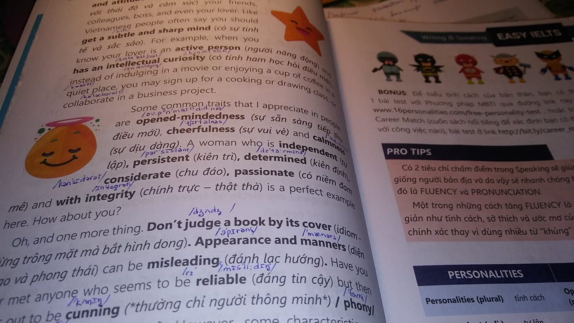 Bạn đang chuẩn bị thi IELTs mà chưa biết bắt đầu từ đâu? Vốn từ vựng còn thiếu hay cách diễn đạt còn gượng gạo, chưa mượt mà và tự nhiên là điểm yếu của bạn? Cuốn IELTS No Vocab No Worries sẽ giúp bạn “hóa giải” những trở ngại trên con đường chinh phục đỉnh cao IELTs. Cuốn sách được in màu với những hình minh họa sinh động, đề cập đến nhiều chủ đề khác nhau trong các đề thi thực của IELTs giúp thí sinh nâng cao vốn từ vựng cần thiết và lối tư duy để nảy ra ý tưởng và ứng biến với mọi trường hợp, mọi câu hỏi. Những mẹo nhỏ cũng được tác giả chọn lọc và trình bày ngắn gọn, dễ hiểu. Đây quả là một cuốn sách thiết thực mà bất cứ ai trên hành trình chinh phục tấm chứng chỉ IELTS cũng nên sở hữu cho mình một cuốn. Về tác giả: Tác giả Vũ Hải (Ryan) là thầy giáo IELTs nổi tiếng với phương pháp học Sketchnotes giúp học sinh đạt 6.5 chỉ trong 2 tháng thông qua sự kết hợp bài bản giữa tư duy, ngôn ngữ, hình ảnh trong các chủ đề học. Ryan cũng là người sáng lập ra Easy IELTS với Ryan và kể từ năm 2017, anh đã đào tạo gần 40 học sinh đạt học bổng ở các nước thuộc top đầu thế giới về giáo dục, trong đó có Nguyễn Đỗ Phương Uyên (nữ sinh giành được 9 học bổng đại học Mỹ). Nhận xét về cuốn No Vocab – No Worries: “Nếu bạn đang đi tìm một cuốn sách giúp tháo gỡ mọi rắc rối về việc ôn thi IELTS, thì mình có lời khuyên chân thành rằng ‘No vocab – No worries’ thực sự là ‘must-have material’ đấy. Cực kỳ nể trọng trình độ và tâm huyết của thầy trong từng trang sách, mình chắc chắn mọi câu chữ trong quyển sách này đều có khả năng giúp bạn “từ zero thành hero”. “Mình tin là cuốn sách sẽ không khiến bạn thất vọng đâu.” – cô Phan Quỳnh, IELTS instructor tại IELTS IDP Education, HCM.