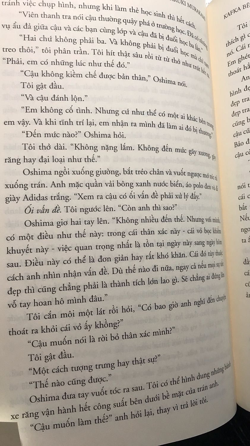 Kafka bên bờ biển (Tái Bản 2020) Kafka Tamura, mười lăm tuổi, bỏ trốn khỏi nhà ở Tokyo để thoát khỏi lời nguyền khủng khiếp mà người cha đã giáng xuống đầu mình.Ở phía bên kia quần đảo, Nakata, một ông già lẩm cẩm cùng quyết định dấn thân. Hai số phận đan xen vào nhau để trở thành một tấm gương phản chiếu lẫn nhau. Trong khi đó, trên đường đi, thực tại xào xạc lời thì thầm quyến rũ. Khu rừng đầy những người linh vừa thoát khỏi cuộc chiến tranh vừa qua, cá mưa từ trên trời xuống và gái điếm trích dẫn Hegel. Kafka bên bờ biển, câu chuyện hoang đường mở đầu thế kỷ XXI, cho chúng ta đắm chìm trong một chuyến du hành đầy sóng gió đầy chất hiện đại và mơ mộng trong lòng Nhật Bản đương đại. Haruki Murakami, nhà văn Nhật đương đại nổi tiếng với những tác phẩm như Rừng Nauy; Xứ sở kỳ diệu vô tình và Nơi tận cùng thế giới; Phía Nam biên giới, Phía Tây mặt trời; Người tình Sputnik, Biên niên ký chim vặn dây cót và Kafka bên bờ biển. Nhận định “Tác giả Nhật được yêu thích nhất tại Mỹ này có thể xuất bản ẩn danh tác phẩm này mà những fan của ông vẫn sẽ nhận ra tức khắc. Còn với những ngưòi đọc lần đầu, Kaffa bên bờ biển sẽ là giải thích xuất sắc cho tiếng tăm xứng đáng của ông cả ở phương Tây lẫn ở quê nhà. Ông viết ra loại văn hậu hiện đại, triết lý, hoang đường mà đọc thì thật lý thú, ông trầm trọng hơn Tom Robbins, nhẹ nhõm hơn Thomas Pynchon.” (Steven Moore, The Washington Post) “Một cuốn sách để-ngấu-nghiến thật sự, cũng thật là một ám ảnh siêu hình dai dẳng [] Đằng sau những cuộc phiêu lưu điên rồ và bất ổn theo lối biểu tượng của nhân vật chính, còn có một lực đẩy trong tìm thức gần ngang bằng với lực đẩy của sex và tuổi trưởng thành: lực đầy về phía hư vô, về khoảng trống, về sự rỗng không đầy hoan lạc. Murakami là hoạ sĩ nhẹ nhàng của những khoảng-chân-không.” (John Updike, The New Yorker) “Cuốn sách là một hỗn hợp chừng mực giữa giật gân, kỳ ảo và văn chương, và nó thuyết phục một cách đặc biệt. Lại một lần nữa ông đã tạo ra một câu chuyện khiến bạn lật qua nhanh chóng đến lạ, để rồi ghi nhớ và băn khoăn về nó lâu dài.”