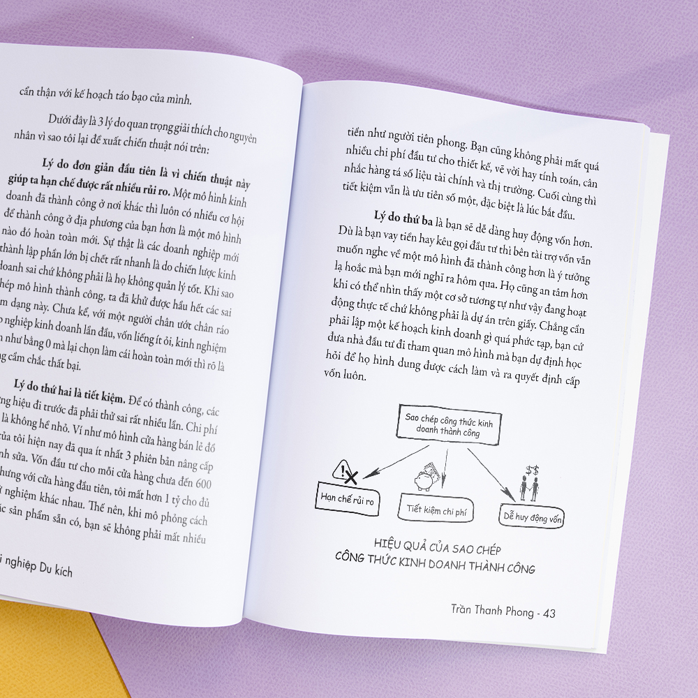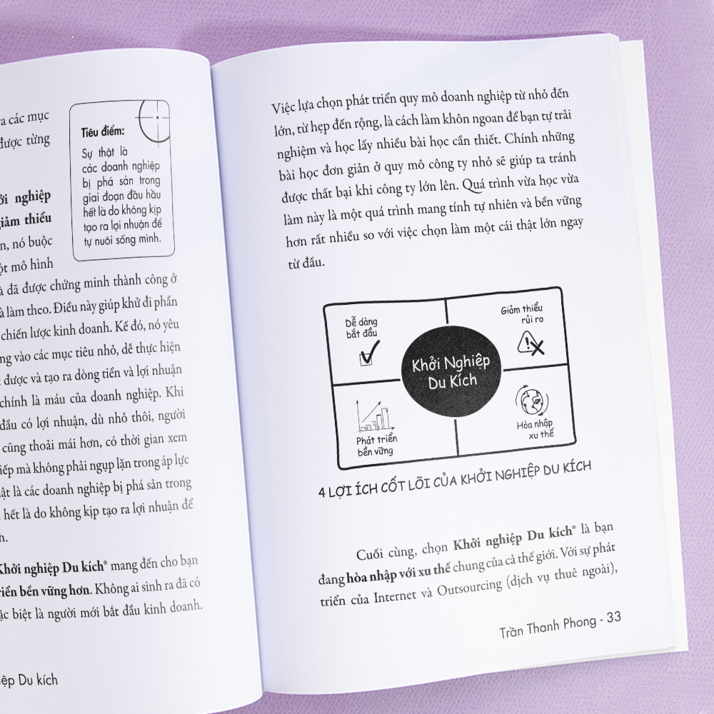 TRẦN THANH PHONG LÀ AI? Anh là tác giả của 3 cuốn sách, chủ của 2 doanh nghiệp và là một vận động viên ba môn phối hợp Ironman. Anh được mọi người nhắc đến như là một tác giả Việt đầu tiên viết về chủ đề Khởi Nghiệp Kinh Doanh Thực Chiến. Anh không phải là diễn giả hay học giả mà là một người làm nghề thực sự. Sau 15 năm khởi nghiệp, từng quản lý nhiều công việc kinh doanh, trong đó có chuỗi thời trang nhượng quyền lên đến 65 cửa hàng trên toàn quốc, anh đã đúc kết nhiều kinh nghiệm hết sức thực tế và gói gọn trong tập sách này. KHỞI NGHIỆP DU KÍCH – SƠ ĐỒ CHIẾN THUẬT THÔNG MINH CHO NGƯỜI KINH DOANH VỚI NGUỒN VỐN HẠN HẸP Hầu hết các doanh nhân trẻ khi chân ướt chân ráo khởi động doanh nghiệp của mình đều trong tình trạng thiếu hụt nguồn lực. Trong khi đó, đối thủ có sẵn trên thương trường thì luôn có lợi thế, kinh nghiệm và nhiều nguồn lực hơn. Để giành chiến thắng, người đến sau phải biết vận dụng những chiến thuật đặc biệt, linh hoạt, khôn ngoan và khéo léo, đúng theo tinh thần của chiến lược chiến tranh du kích. Theo đó, Khởi nghiệp Du kích là tập hợp các chiến thuật để khởi sự kinh doanh, quản lý doanh nghiệp, đề cao tính tinh gọn, hiệu quả và tập trung. Nó đặc biệt phù hợp cho những ai đang từng bước lập nghiệp với kinh nghiệm ít ỏi và nguồn vốn hạn hẹp. Trong quyển sách này bạn sẽ tìm thấy: 6 định hướng để tìm kiếm ý tưởng kinh doanh an toàn. 9 phương pháp huy động vốn hiệu quả kiểu du kích. Tập hợp nhiều chiến thuật tổ chức doanh nghiệp và quản lý đội nhóm tinh gọn, năng suất cao với những công cụ hỗ trợ rẻ tiền, sẵn có. Các chiến thuật tiếp thị kiểu du kích mang lại dòng tiền ngay với chi phí đầu tư thấp. Phương thức tập trung nguồn lực và mở rộng công việc kinh doanh hiệu quả với ít rủi ro. Hy vọng bạn sẽ có được thật nhiều bài học thú vị và áp dụng thành công cho doanh nghiệp của mình.