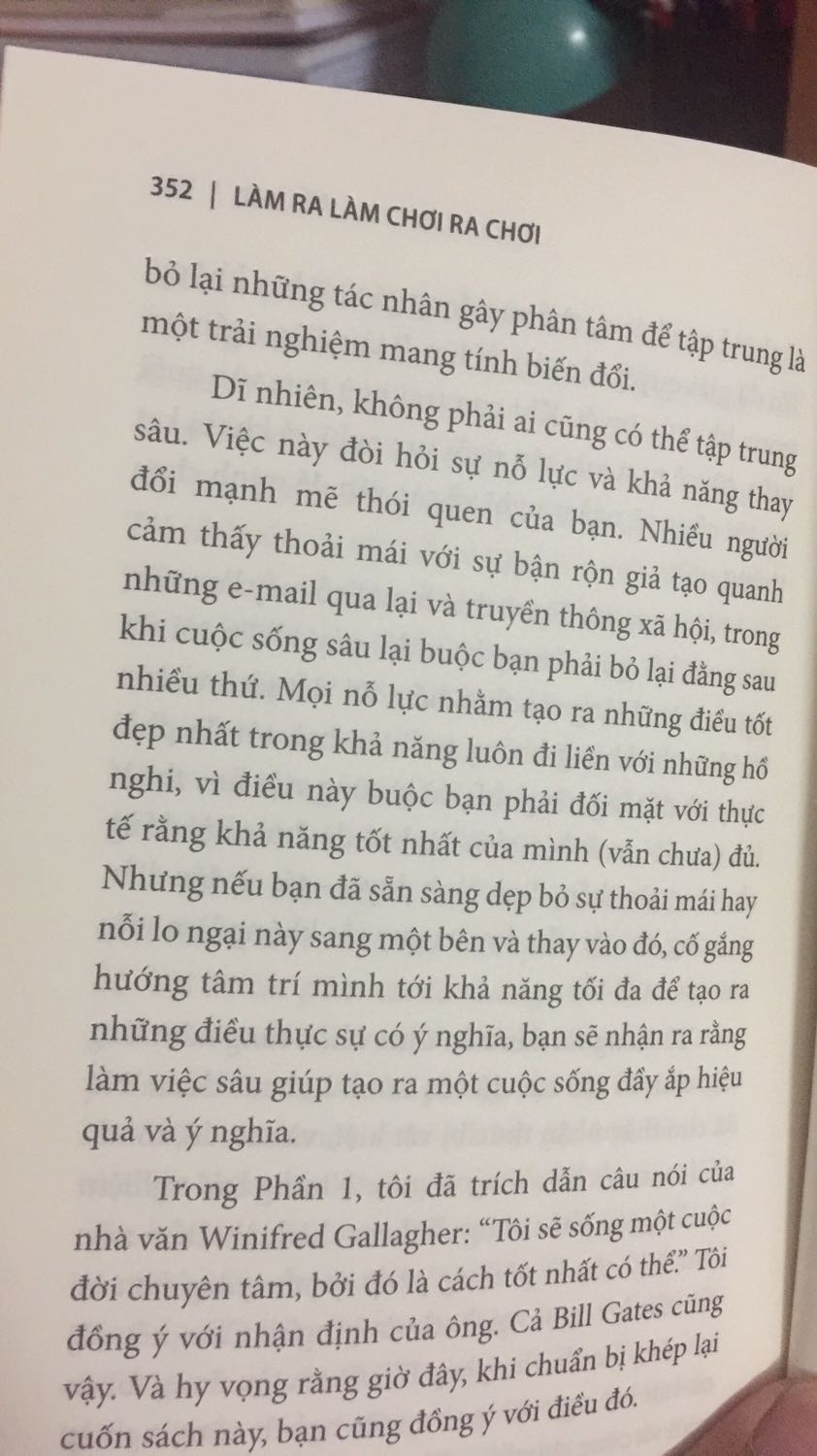 Làm Ra Làm Chơi Ra Chơi Đã bao giờ bạn ngồi xuống để làm việc và sau đó, không hề nhận ra mình lại kết thúc bằng việc dành một (vài) tiếng đồng hồ lướt Youtube, Facebook, tin tức? Tất cả chúng ta đều đã từng làm vậy. Có vẻ như có quá nhiều thứ lôi kéo sự chú ý của chúng ta trong thời đại này, nên rất khó để thậm chí đạt đến trạng thái tinh thần giúp hoàn thành công việc một cách tốt nhất. Trong Làm ra làm chơi ra chơi, tác giả Cal Newport nhấn mạnh chủ đề “làm việc sâu” (deep work) đang ngày càng được chú trọng. Học cách làm thế nào để làm việc sâu – khả năng tập trung vào một nhiệm vụ khó nhằn mà không hề bị sao lãng – là chìa khóa để tạo ra những kết quả tốt hơn trong thời gian ngắn hơn. Cuốn sách đưa ra hai mục tiêu, được chia làm hai phần. Phần 1 nhằm thuyết phục bạn rằng giả thiết về làm việc sâu là đúng. Phần 2 giới thiệu đến bạn một số cách để tận dụng làm việc sâu bằng cách rèn luyện não bộ và chuyển đổi thói quen làm việc sang hướng đặt làm việc sâu ở trung tâm sự nghiệp. Newport không hề đưa ra những lời khuyên xáo rỗng, mang tính lý thuyết hay giáo điều. Ông đề nghị chúng ta nên học cách làm quen với sự hời hợt và từ bỏ các công cụ truyền thông xã hội như Facebook, Instagram, (Thậm chí, nếu bạn không muốn làm vậy thì lỹ lẽ của ông cũng rất đáng đọc). Nếu bạn đã từng dành một ngày làm việc trong tình trạng bị sao lãng bởi đám email và thông báo hiện lên liên tục rồi băn khoăn bạn đã làm gì cả ngày thì đây chính là cuốn sách dành cho bạn.