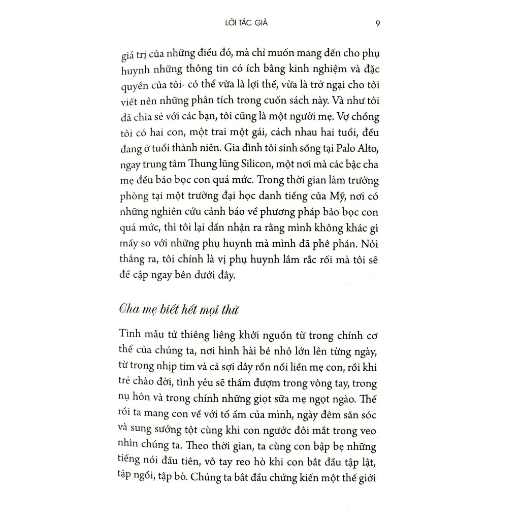 Nhiều bậc cha mẹ đang che chở và làm thay con trẻ nhiều điều, lập trình mọi thứ cho con từ việc học, việc chơi tới việc làm, kiểm soát các mối quan hệ tình cảm của con và cả đường đời của con. Tất cả đều xuất phát từ tình yêu thương con và cả nỗi lo sợ trước thế giới nhiều hiểm họa. Điều này đang đưa đến một hậu quả tệ hại: khi tới tuổi trưởng thành, con cái của chúng ta sẽ là những “người lớn trẻ con”, đi làm thì phải có người cầm tay chỉ việc, gặp trở ngại một chút là khủng hoảng tinh thần và không tự giải quyết được bất trắc nếu cha mẹ không nhúng tay vào. Nhiều bạn trẻ có học vị cao, công việc tốt, đời sống vương giả, thậm chí nổi tiếng trong một lĩnh vực nào đó, nhưng từ trong thâm tâm lại cảm nhận mình đang sống một cuộc đời vay mượn từ cha mẹ, cảm nhận mình đang thất bại trong khi cha mẹ và nhiều người khác thấy đó là thành công.Chuyện cứ như ở Việt Nam nhưng bạn đọc sẽ bất ngờ vì nó đang xảy ra tại Mỹ, phổ biến và gây tổn hại giới trẻ đến mức phải gióng hồi chuông cảnh tỉnh cha mẹ: Hãy ngừng bảo bọc con thái quá!Là trưởng phòng Phòng Công tác và Tư vấn Sinh viên của Đại học Standfort (Hoa Kỳ), cũng là mẹ của hai con đang tuổi thành niên, tác giả Julie Lythcott-Haims đã quan sát thực tế, phân tích và nghiên cứu để đưa ra một phương cách lành mạnh hơn, một tình yêu thương tỉnh táo và sáng suốt hơn giúp trẻ thực sự trưởng thành, cũng như cách tạo động lực cho chính cha mẹ thực hiện nhiệm vụ cao cả này.Ấn phẩm cũng cần thiết với những gia đình đang có dự định cho con đi du học ở Mỹ hay các nước phương Tây.Mời bạn đón đọc. Tác giả: Julie Lythcott-Haims Nhà Xuất Bản: Nxb Trẻ Nhà Phát Hành: NXB Trẻ Năm Xuất Bản: 2016 Số Trang: 600
