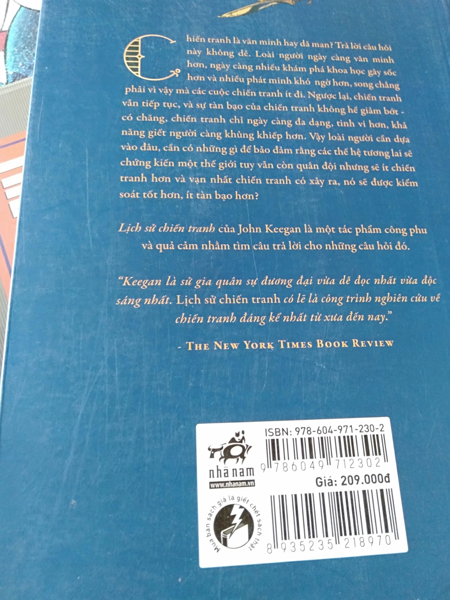 Chiến tranh là văn minh hay dã man? Trả lời câu hỏi tưởng như dễ này, không dễ. Loài người ngày càng văn minh hơn, ngày càng nhiều khám phá khoa học gây sốc hơn và nhiều phát minh khó ngờ hơn, song chẳng phải vì vậy mà các cuộc chiến tranh ít đi. Ngược lại, chiến tranh vẫn tiếp tục, và sự tàn bạo của chiến tranh không hề giảm bớt – có chăng, chiến tranh chỉ ngày càng đa dạng, tinh vi hơn, khả năng giết người càng khủng khiếp hơn. Vậy loài người cần dựa vào đâu, cần có những gì để bảo đảm rằng các thế hệ tương lai sẽ chứng kiến một thế giới tuy vẫn còn quân đội nhưng sẽ ít chiến tranh hơn và vạn nhất chiến tranh có xảy ra, nó sẽ được kiểm soát tốt hơn, ít tàn bạo hơn? Lịch sử chiến tranh của John Keegan là một tác phẩm công phu và quả cảm nhằm tìm câu trả lời không dễ cho những câu hỏi đó. “Keegan là sử gia quân sự đương đại vừa dễ đọc nhất vừa độc sáng nhất. Lịch sử chiến tranh có lẽ là công trình nghiên cứu về chiến tranh đáng kể nhất từ xưa đến nay.” – The New York Times Book Review.