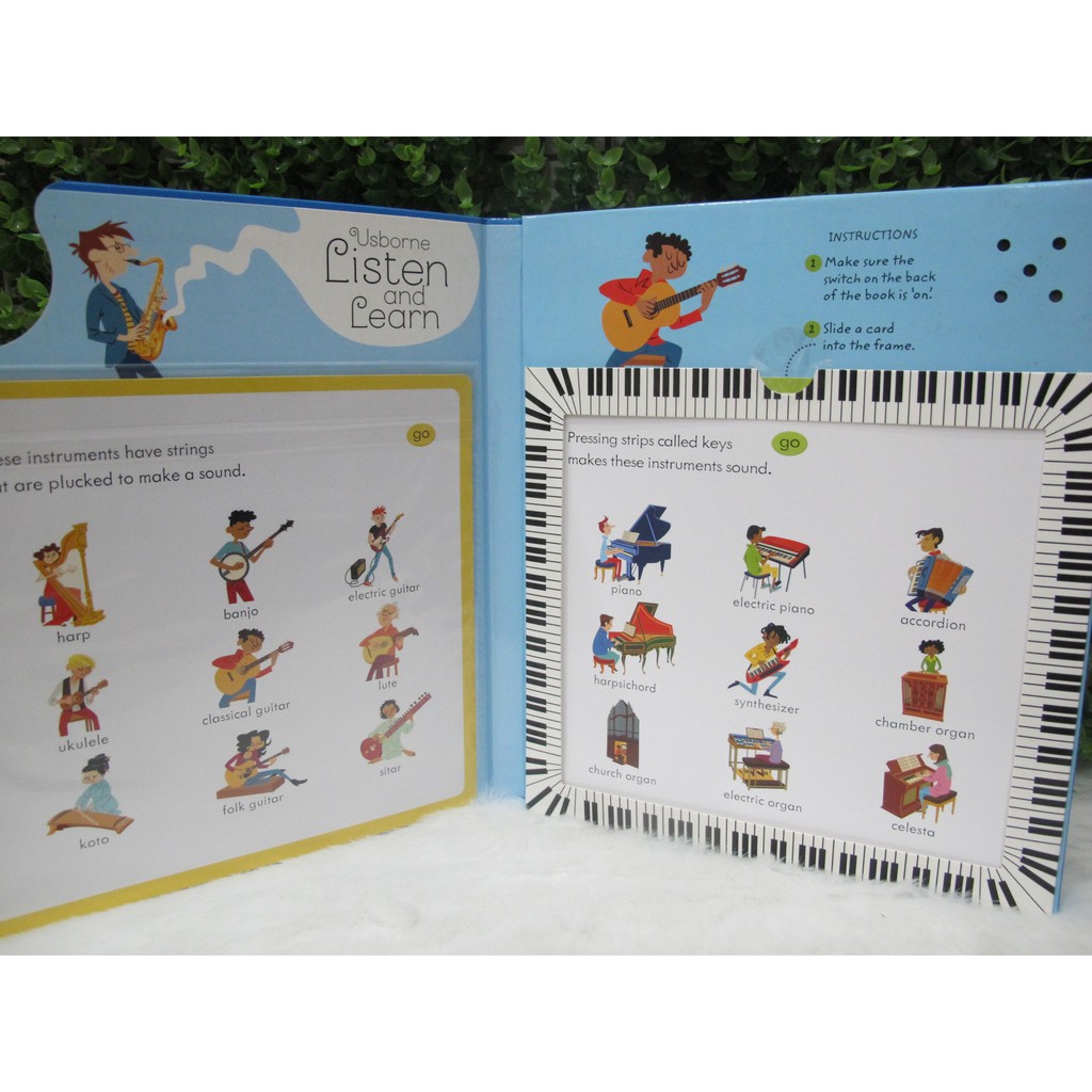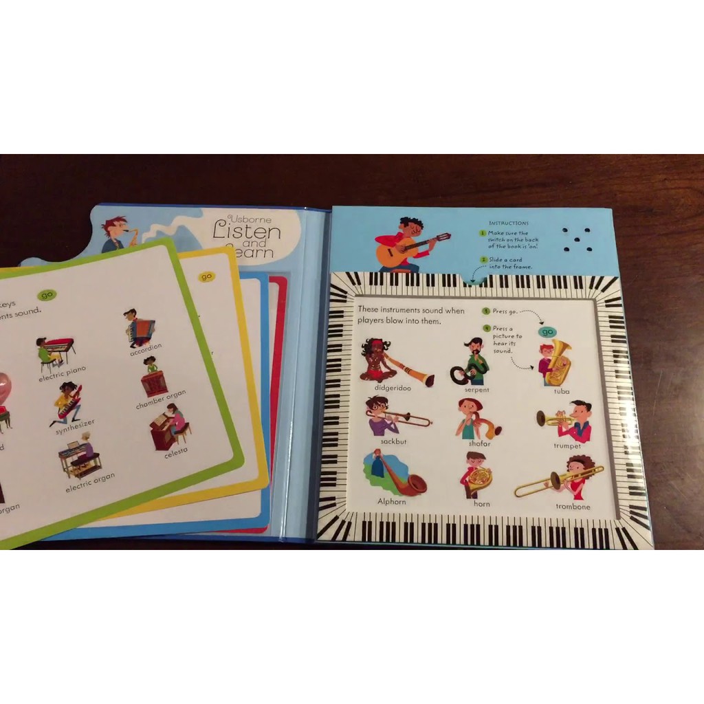 1. Sách – Listen and learn Musical Instruments Listen and learn Musical Instruments là dòng sách vô cùng đặc biệt đến từ NXB Usborne, dành cho các bé từ 3+ khám phá các loại nhạc cụ khác nhau Có đến 70 nhạc cụ, được phân chia thành nhiều thể loại. Các bé sẽ cho tấm thẻ vào, kích hoạt pin, nhấn vào hình ảnh để nghe âm thanh của nhạc cụ đó Đây là bước đầu giúp các bé cảm thụ thanh âm, thêm hứng thú với sách và đặc biệt là biết rất nhiều từ vựng liên quan đến âm nhạc nhé. Sách bìa cứng, gồm 4 tấm thẻ, thể hiện 70 nhạc cụ khác nhau. Sách dùng các con chip, pin có sẵn trong sách đầy đủ. 2. Thông tin Sách – Listen and learn Musical Instruments: Độ tuỏi: 3+ Sách bìa cứng Mã ISBN: 9781474921275 Kích thước: 250 x 214mm Minh Họa Sean Longcroft