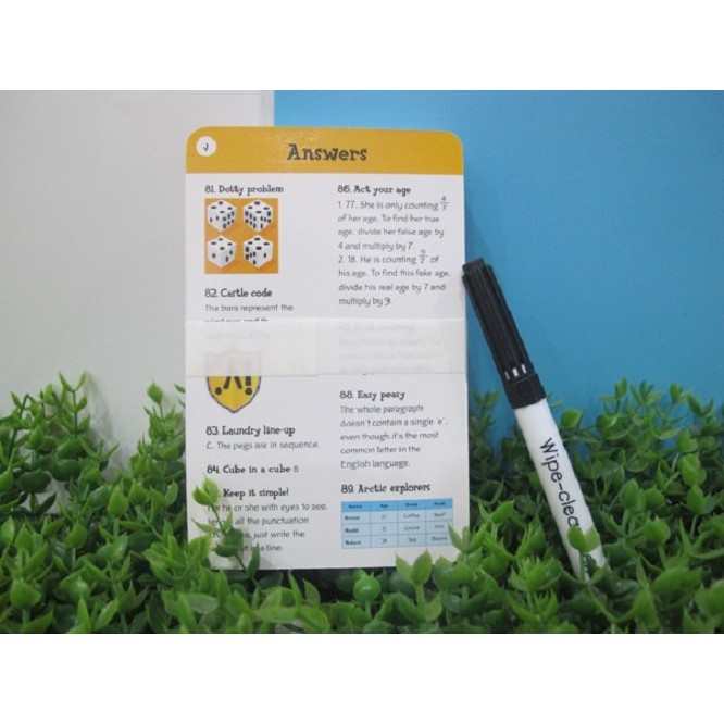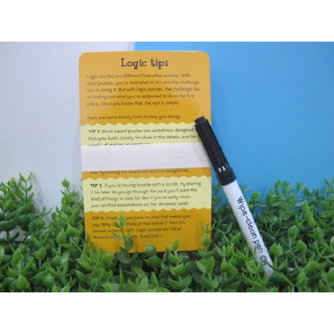 1. Giới thiệu Sách – Logic Puzzles Bộ puzzle vô cùng đặc biệt vì bao gồm 50 thẻ được cán bóng, có kèm theo bút lông để các bé có thể chơi và viết trực tiếp trên thẻ, sau đó có thể xóa và viết lại được Bộ sản phẩm bao gồm nhiều hoạt động liên quan đến logic, rèn trí thông minh,… thích hợp cho các bé từ 6 tuổi, vừa giúp giải trí, vừa học thêm nhiều từ tiếng Anh theo ngữ cảnh, vừa rèn tính phán đoán và khả năng tư duy logic nữa 2. Thông tin Sách – Logic Puzzles Độ tuổi 6+ Hộp bao gồm 50 thẻ và một bút lông ISBN: 9780746089132 Kích thước: 154 x 98mm Tác giả Lucy Bowman Nhà xuất bản: Usborne Năm xuất bản 2018