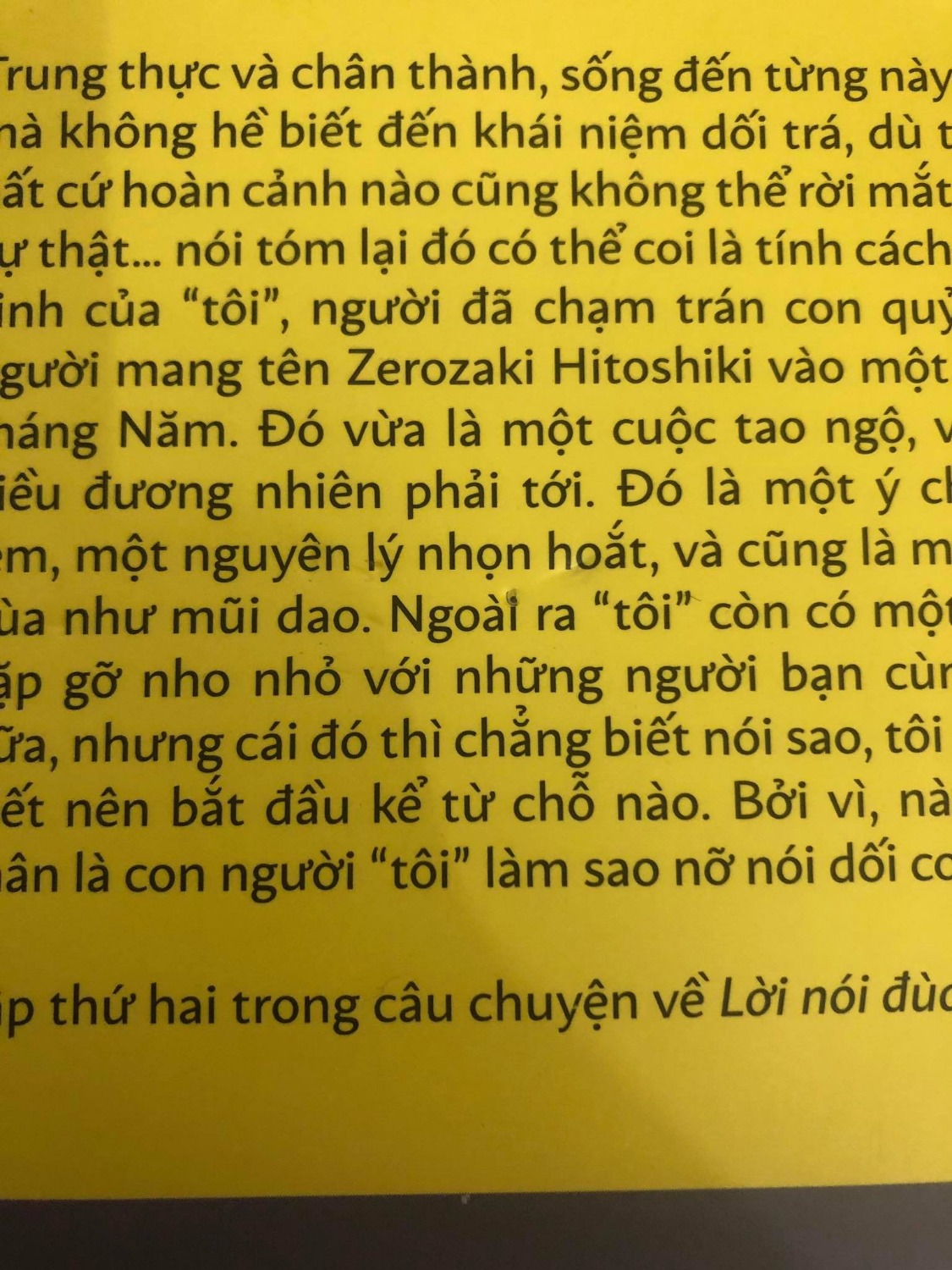 Yêu một người thì dễ, nhưng tiếp tục yêu họ thì khó. Cũng giống như giết người thì dễ, nhưng tiếp tục giết người thì khó vậy. Trung thực và chân thành, sống đến từng này tuổi mà không hề biết đến khái niệm dối trá, dù trong bất cứ hoàn cảnh nào cũng không thể rời mắt khỏi sự thật… nói tóm lại đó có thể coi là tính cách bẩm sinh của “tôi”, người đã chạm trán con quỷ giết người mang tên Zerozaki Hitoshiki vào một ngày tháng Năm. Đó vừa là một cuộc tao ngộ, vừa là điều đương nhiên phải tới. Đó là một ý chí sắc lẻm, một nguyên lý nhọn hoắt, và cũng là một trò đùa như mũi dao. Ngoài ra “tôi” còn có một cuộc gặp gỡ nho nhỏ với những người bạn cùng lớp nữa, nhưng cái đó thì chẳng biết nói sao, tôi chẳng biết nên bắt đầu kể từ chỗ nào. Bởi vì, này nhé, thân là con người, “tôi” làm sao nỡ nói dối cơ chứ… Tác phẩm đầu tay viết năm mười tám tuổi đã đoạt ngay giải thưởng Mephisto danh giá, đưa tên tuổi Nisio Isin đến với độc giả Light Novel Nhật Bản, trở thành nguồn cảm hứng cho hàng loạt tiểu thuyết gia trẻ tuổi trong suốt thập kỷ đó. VỀ TÁC GIẢ Nisio Isin (sinh năm 1981) được mệnh danh là cây bút thiên tài trong làng Light Novel Nhật Bản với rất nhiều tác phẩm đình đám. Năm 2002 khi đang theo học đại học Ritsumeikan, Nisio Isin ra mắt với tác phẩm “Vòng xoáy chặt đầu”, tập đầu tiên trong series Lời nói đùa, và đã giành giải Mephisto lần thứ 23 ở tuổi đôi mươi. Bộ truyện đã có gần 4 triệu bản được bán ra tại Nhật và nhiều năm liên tiếp lọt top 3 của bảng xếp hạng Kono Light Novel ga Sugoi! Sau khi rời khỏi trường đại học, Nisio Isin làm việc cho nhà xuất bản nổi tiếng Kodansha, chuyên về các tạp chí dành cho các cây bút trẻ như Faust hoặc Pandora. Tháng 1 năm 2007, Nisio Isin ra mắt series Đao Ngữ dưới nhãn Kodansha Box, với tiến độ mỗi tháng một tập, tổng cộng 12 tập đã được xuất bản đều đặn trong vòng một năm. Các tiểu thuyết Đao ngữ, Lời nói đùa, Monogatari, Medaka Box và Juni Taisei của ông đã được chuyển thể thành anime. TRÍCH ĐOẠN Mỗi khi nghĩ về Zerozaki, tôi chỉ có thể lý giải cậu ta bằng một khái niệm duy nhất: “hình ảnh phản chiếu trên mặt nước”. Nếu không hiểu như vậy, có lẽ hành động diễn tả kẻ mất tư cách làm người ấy bằng ngôn từ cũng sẽ trở nên vô nghĩa mất thôi. Nhưng thay vì suy xét về hành động diễn tả, có lẽ câu hỏi chúng ta cần phải trả lời sẽ là: Vốn ngay từ đầu ở Zerozaki có tồn tại thứ gọi là “ý nghĩa” hay không? Giống như danh xưng “kẻ thích đùa” của tôi không mang một ý nghĩa nào cụ thể, đánh giá kẻ giết người ấy thông qua biểu hiện bên ngoài chẳng khác nào tin vào mấy bài giải mẫu đã bị sai lầm từ lâu. Nên diễn tả cảm giác ấy thế nào nhỉ? Tựa như đang đứng trước bản thể của chính mình, tựa như đang nói chuyện với chính bản thân mình, một câu chuyện với cốt truyện vừa kỳ quặc lại vừa hợp lý. Phải rồi. Cho nên, ngay từ đầu đây đã là một cuộc gặp gỡ tình cờ bất khả thi. Có lẽ, đó là trải nghiệm nguyên sơ nhất. Là ngôn từ đầu tiên mà ta nghe thấy. Là những ghi chép vào bộ nhớ gốc. Là quá khứ ta có thể liên tưởng và so sánh. Là véc-tơ cùng gốc, cùng phương hướng. Tựa như còn bình thường hơn cả bình thường. Tựa như hình ảnh phản chiếu trên mặt gương. Nói tóm lại, chúng tôi quá giống nhau. Quà tặng kèm: Bookmark giấy Card mica trong suốt 10x15cm (Số lượng giới hạn) Móc chìa khóa mica (số lượng giới hạn)