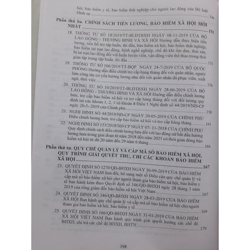 Luật bảo hiểm xã hội và các chính sách mới về bảo hiểm năm 2020 Tác giả: Vũ Thị Tươi Phát hành: 2020 Nhà xuất bản: Lao Động Số trang: 400 trang Kích thước: 20 x 28 cm Hình thức bìa: Bìa mềm Giá bìa: 395.000 VND Công ty phát hành: Nhà Xuất bản Chính trị Quốc gia Sự thật Lời giới thiệu: Chính sách bảo hiểm xã hội, bảo hiểm y tế là chính sách lớn của Đảng và Nhà nước, việc cải cách chính sách bảo hiểm xã hội, bảo hiểm y tế là vấn đề hệ trọng liên quan trực tiếp đến đời sống nhân dân, đến phát triển kinh tế và an toàn xã hội. Thời gian qua, Chính phủ và các Bộ ngành đã ban hành nhiều chính sách mới về bảo hiểm xã hội, bảo hiểm y tế. Các chính sách bảo hiểm mới đã từng bước được đổi mới, gắn kết hơn với hệ thống an sinh xã hội, hướng vào phát triển con người, thực hiện công bằng xã hội. Cụ thể Điều 219 Bộ luật Lao động 2019 sửa đổi Luật Bảo hiểm xã hội 2014 điều chỉnh điều kiện hưởng lương hưu của người lao động từ 2021, Nghị định 44/2019/NĐ-CP ngày 20-5-2019 Điều chỉnh lương hưu, trợ cấp bảo hiểm xã hội và trợ cấp hàng tháng, Nghị quyết 05/2019/NQ-HĐTP ngày 15-8-2019 Hướng dẫn áp dụng Điều 214 về tội gian lận bảo hiểm xã hội, bảo hiểm thất nghiệp, Điều 215 về tội gian lận bảo hiểm y tế và Điều 216 về tội trốn đóng bảo hiểm xã hội, bảo hiểm y tế, bảo hiểm thất nghiệp cho người lao động của Bộ luật Hình sự.. Để các cơ quan đơn vị, doanh nghiệp, người lao động có các tài liệu nói trên, Nhà xuất bản Lao Động giới thiệu cuốn sách: LUẬT BẢO HIỂM XÃ HỘI VÀ CÁC CHÍNH SÁCH MỚI VỀ BẢO HIỂM NĂM 2020 Nội dung cuốn sách gồm các phần chính sau: Phần thứ nhất. NHỮNG THAY ĐỔI MỚI TRONG CHÍNH SÁCH BẢO HIỂM XÃ HỘI NĂM 2020 Phần thứ hai. LUẬT BẢO HIỂM XÃ HỘI VÀ VĂN BẢN HƯỚNG DẪN THI HÀNH Phần thứ ba. CHÍNH SÁCH TIỀN LƯƠNG, BẢO HIỂM XÃ HỘI MỚI NHẤT Phần thứ tư. QUY CHẾ QUẢN LÝ VÀ CẤP MÃ SỐ BẢO HIỂM XÃ HỘI, QUY TRÌNH GIẢI QUYẾT THU, CHI CÁC KHOẢN BẢO HIỂM XÃ HỘI Phần thứ năm. LUẬT BẢO HIỂM Y TẾ VÀ VĂN BẢN HƯỚNG DẪN THI HÀNH.