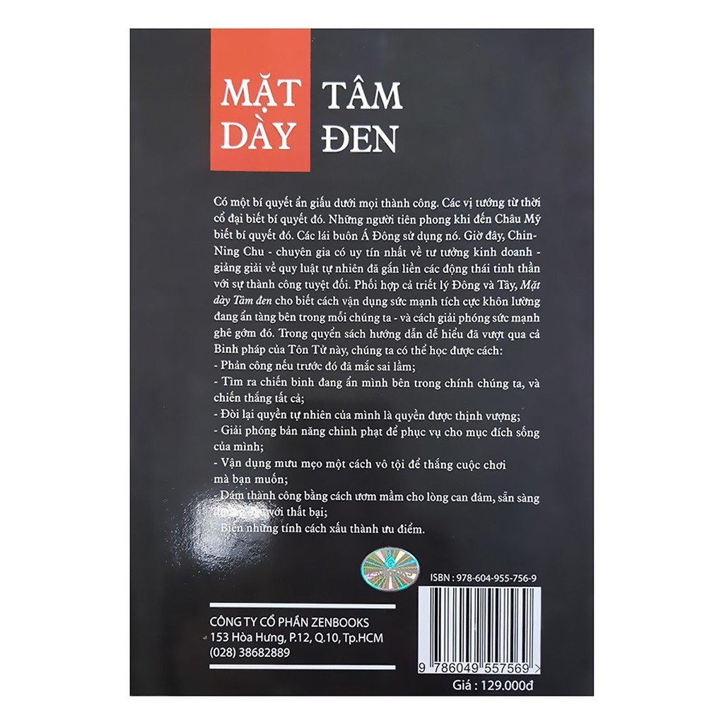 Công ty phát hành: Zenbooks Nhà xuất bản: Nhà Xuất Bản Hồng Đức Tác giả: Chin-Ning Chu Năm xuất bản: 08-2017 Kích thước: 14.5 x 20.5 Loại bìa: Bìa mềm Số trang: 423 Giới thiệu sản phẩm: Mặt Dày Tâm Đen Có một bí quyết ẩn giấu dưới mọi thành công. Các vị tướng từ thời cổ đại biết bí quyết đó. Những người tiên phong khi đến Châu Mỹ biết bí quyết đó. Các lái buôn Á Đông sử dụng nó. Giờ đây, Chin-Ning Chu – chuyên gia có uy tín nhất về tư tưởng kinh doanh – giảng giải về quy luật tự nhiên đã gắn liền các động thái tinh thần với sự thành công tuyệt đối. Phối hợp cả triết lý Đông và Tây, ” Mặt Dày Tâm Đen” cho biết cách vận dụng sức mạnh tích cực khôn lường đang ẩn tàng bên trong mỗi chúng ta – và cách giải phóng sức mạnh ghê gớm đó. Trong cuốn sách hướng dẫn để hiểu đã vượt qua cả Binh pháp Tôn tử này, chúng ta có thể học được cách: Phản công nếu trước đó đã mắc sai lầm. Tìm ra chiến binh đang ẩn mình bên trong chính chúng ta, và chiến thắng tất cả. Đòi lại quyền tự nhiên của mình là quyền được thịnh vượng. Giải phóng bản năng chinh phạt để phục vụ cho mục đích sống của mình. Vận dụng mưu mẹo một các vô tội để thắng cuộc chơi mà bạn muốn. Dám thành công bằng cách ươm mầm cho lòng can đảm, sẵn sàng đương đầu với thất bại. Biến những tính cách xấu thành ưu điểm. “*** Bìa sách thay đổi theo từng đợt nhập hàng.