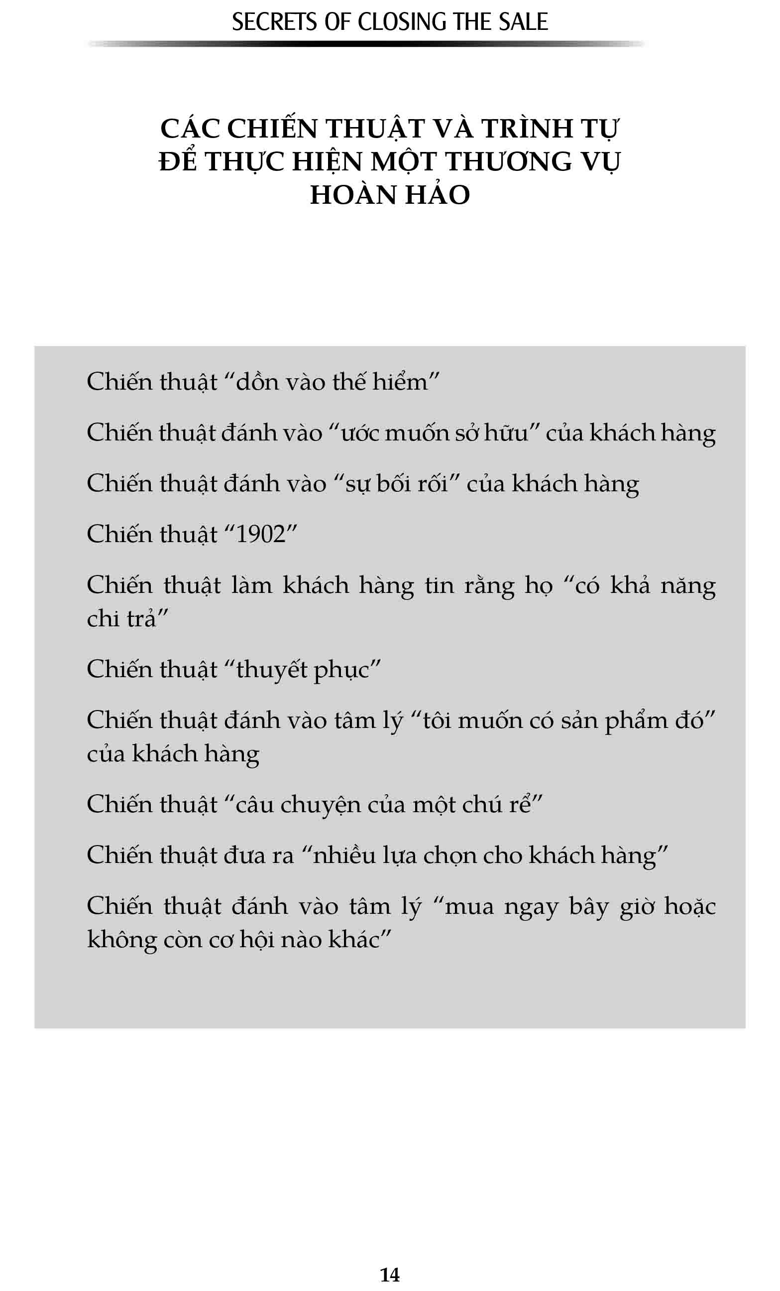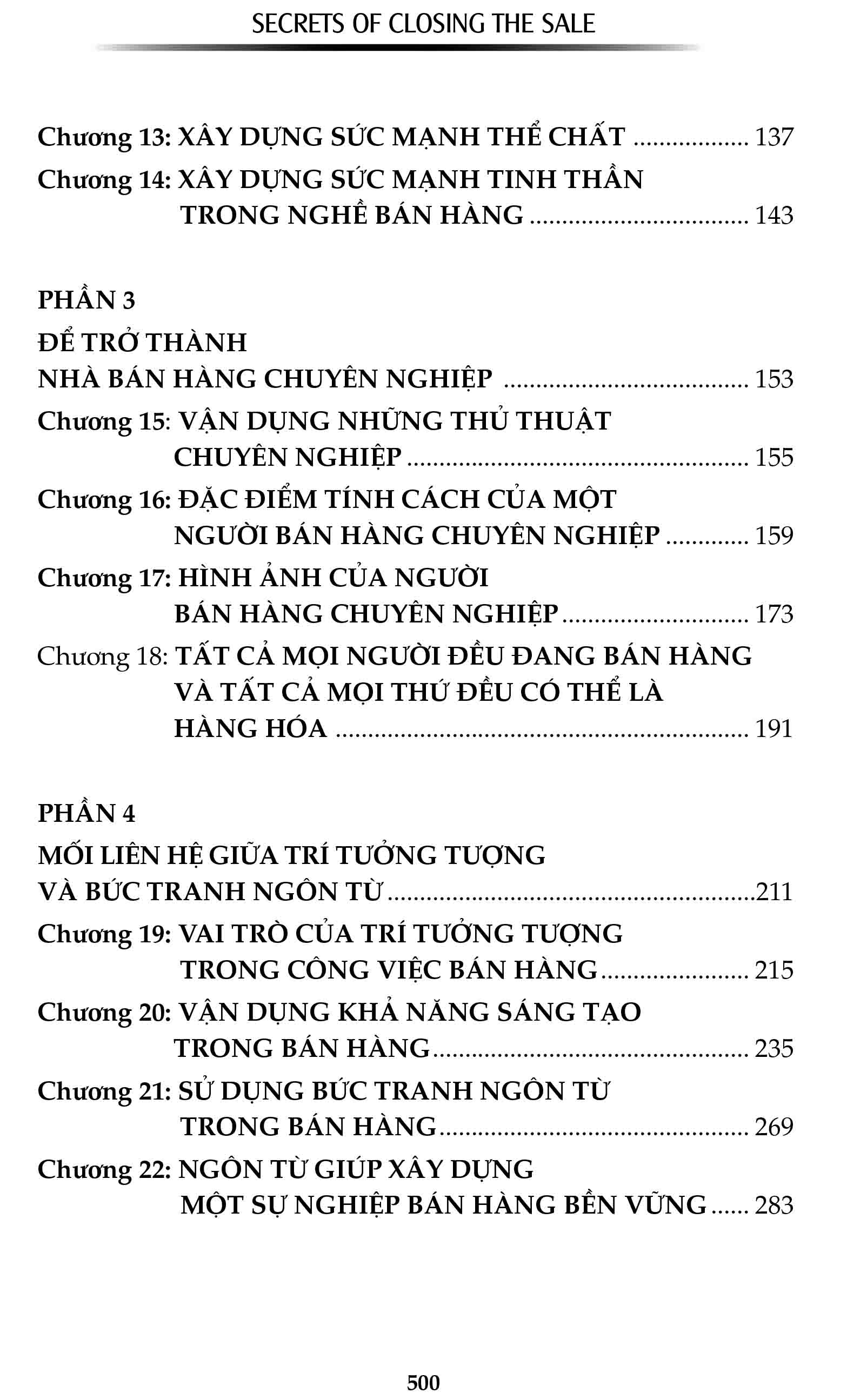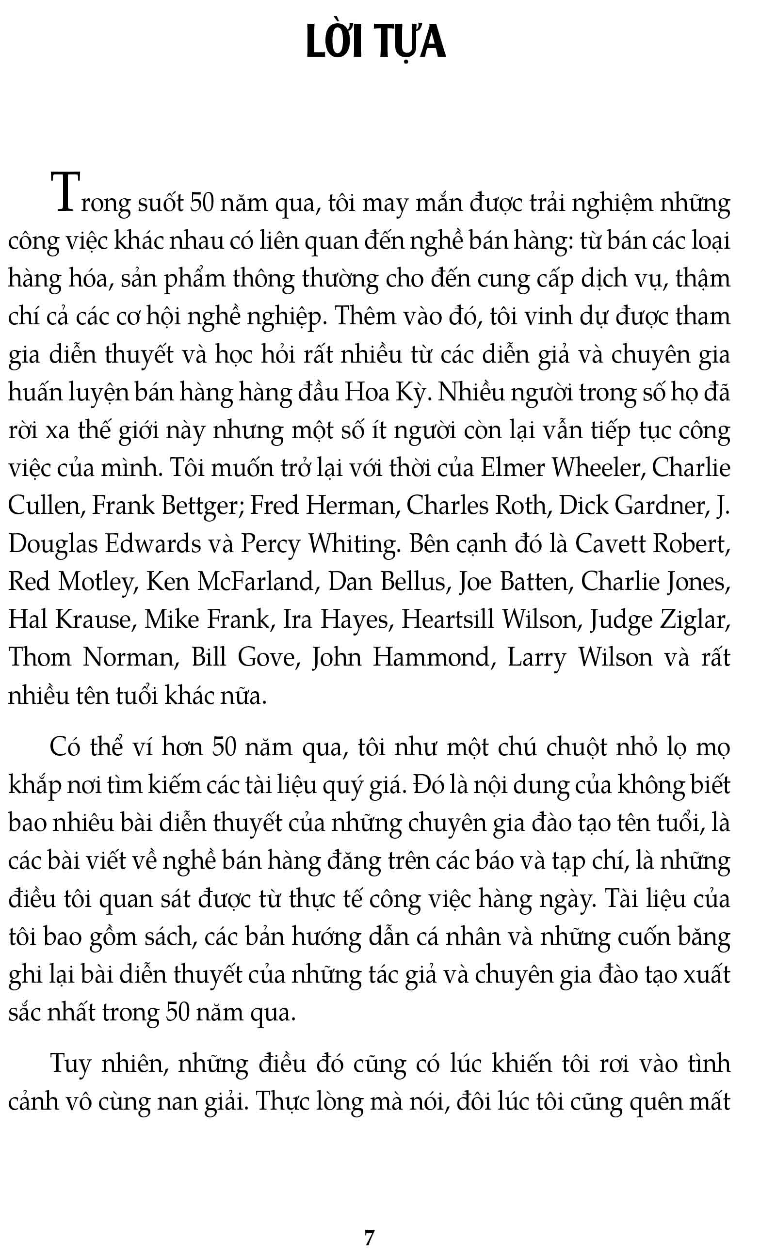 Mục tiêu của một thương vụ là đảm bảo khách hàng nhận được giá trị tương xứng, nhưng nếu bạn mang đến cho khách hàng những giá trị còn cao hơn giá trị mà lẽ ra họ sẽ nhận được thì không những bạn đã có một thương vụ thành công mà bạn còn có thêm một khách hàng sẵn lòng giúp bạn có thêm nhiều khách hàng khác nữa. Triết lý chứa đựng trong cuốn sách Nghệ Thuật Bán Hàng Bậc Cao thật đơn giản: “bạn có thể có được những tất cả mọi thứ trong cuộc sống nếu bạn biết giúp người khác đạt được điều họ muốn”, thậm chí còn đúng đắn và cần thiết hơn trong cuộc sống hiện nay so với thời kỳ khi cuốn Nghệ Thuật Bán Hàng Bậc Cao được xuất bản lần đầu. Trong cuốn sách kinh doanh này, bạn sẽ có cơ hội làm quen với nhiều người bán hàng sẵn sàng từ bỏ một thương vụ bởi họ biết rằng thương vụ đó không mang lại lợi ích tốt nhất cho khách hàng của mình. Khi đó, bán hàng trở nên giống như thi đấu thể thao, nhà vô địch quần vợt phải biết đánh bóng sao cho anh ta có thể đánh cú tiếp theo hiệu quả hơn, hay các tay gôn kỳ cựu cũng vậy. Nếu nhân viên bán hàng không quan tâm đến việc xây dựng và duy trì mối quan hệ tốt đẹp với khách hàng mà chỉ chăm chăm kiếm tiền từ túi người khác thì đảm bảo rằng họ sẽ nhanh chóng bị đào thải khỏi nghề này. Khi đọc cuốn sách Nghệ Thuật Bán Hàng Bậc Cao, các bạn cần linh động áp dụng từng nguyên tắc hay nghiều nguyên tắc cùng lúc để phù hợp với sản phẩm của bạn cũng như yêu cầu của khách hàng. Cuốn sách bao gồm rất nhiều ví dụ minh hoạ và những câu chuyện thực tế, được viết theo lối kể chuyện tự nhiên, do vậy bạn cần phải chủ động học hỏi – chứ không chỉ đơn giản chỉ đọc nó mà thôi. Một cuốn sổ tay nhỏ sẽ rất hữu ích trong việc giúp bạn ghi lại những ý tưởng quan trọng. Bạn hãy mạnh dạn đánh dấu vào sách những câu từ cần ghi nhớ và đừng lo lắng là nó sẽ bị cũ hay xấu đi Nên đọc quyển Nghệ Thuật Bán Hàng Bậc Cao này như thế nào? nội dung cuốn sách được viết theo lối kể chuyện, kết hợp với rất nhiều đoạn hội thoại và những mẫu chuyện vui. Hơn 700 câu hỏi và 250 chiến thuật kinh doanh, chiêu thức cũng như các cách thức kết thúc một thương vụ được gói gọn trong gần 100 câu chuyện, bài phân tích và nhiều câu chuyện khác nhau sẽ đem đến cho bạn cảm giác thú vị khi đọc. – “Nếu như chỉ gọi Zig Ziglar là một người bán hàng siêu hạng thì vẫn chưa đủ. Cuốn sách kinh tế này là tập hợp những hiểu biết về nghệ thuật bán hàng mà ông đã dày công sưu tầm. Vì vậy, cuốn sách này rất đáng để các bạn tìm đọc” – Richard M. DeVos, đồng sáng lập Anway, Chủ tịch và chủ sở hữu của NBA Orlando Magic. Trong lần tái bản này, cuốn sách Nghệ Thuật Bán Hàng Bậc Cao đã được đổi sang khổ lớn, bìa mềm với phương cách trang trọng hơn. Cuốn sách Nghệ Thuật Bán Hàng Bậc Cao sẽ tiếp tục là cuốn cẩm nang không thể thiếu với những ai đang hoạt động tranh lĩnh vực kinh doanh, bán hàng.