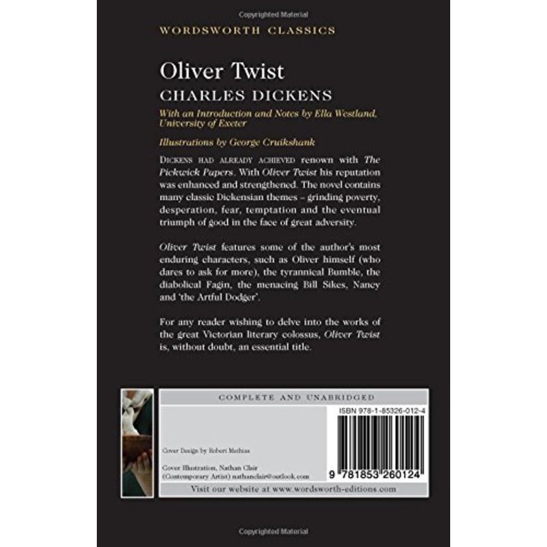 Thông tin sản phẩm : Tác giả: Charles Dickens Nhà Xuất bản : Wordsworth Editions Ltd Nhà phát hành: Wordsworth Editions Ltd Năm xuất bản: 1992 Ngôn ngữ : Tiếng Anh Số trang: 373 ISBN: 9781853260124 Nội dung: Introduction and Notes by Dr Ella Westland, University of Exeter Dickens had already achieved renown with The Pickwick Papers. With Oliver Twist his reputation was enhanced and strengthened. The novel contains many classic Dickensian themes – grinding poverty, desperation, fear, temptation and the eventual triumph of good in the face of great adversity. Oliver Twist features some of the author’s most enduring characters, such as Oliver himself (Who dares to ask for more), the tyrannical Bumble, the diabolical Fagin, the menacing Bill Sykes, Nancy and ‘the Artful Dodger’. For any reader wishing to delve into the works of the great Victorian literary colossus, Oliver Twist is, without doubt, an essential title. Oliver Twist là tiểu thuyết thứ hai của Charles Dickens và được xuất bản lần đầu năm 1838. Câu chuyện xoay quanh nhân vật chính Oliver Twist, câu bé mồ côi được nuôi dưỡng trong một nhà tế bần ở một thị trấn vô danh. Bị đối xử tàn tệ, bị cho đi, rồi bị ngược đãi, không chịu nổi Oliver bèn bỏ trốn đến London nhưng lại rơi vào hang ổ của bọn trộm cắp. Trong hoàn cảnh đen tối ấy, cậu vẫn khát khao hướng thiện và khiến những tấm lòng nhân hậu cảm động. Cuối cùng bọn bất lương bị trừng trị, Oliver thoát khỏi âm mưu của chúng và có được cuộc sống mới trong sạch, hạnh phúc. Oliver Twist là một trong những tác phẩm thành công nhất của Charles Dickens. Cuộc đấu tranh giữa thiện và ác cùng những tấm lòng lương thiện sáng lên trên từng trang sách đã lôi cuốn nhiều thế hệ độc giả từ trẻ em đến người lớn. Cuốn sách cũng rất nhiều lần được chuyển thể thành phim điện ảnh, truyền hình, anime, kịch và nhạc kịch, trong đó bộ phim ca nhạc năm 1968 đã đoạt giải Oscar.