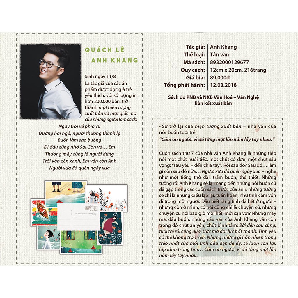 Công ty phát hành: Phương Nam Nhà xuất bản: Nhà Xuất Bản Văn Hóa Văn Nghệ Tác giả: Anh Khang Năm xuất bản: 02-2018 Kích thước: 12 x 20 cm Loại bìa: Bìa mềm Số trang: 216 Giới thiệu sản phẩm: Người Xưa Đã Quên Ngày Xưa Sự trở lại của hiện tượng xuất bản – nhà văn của nỗi buồn tuổi trẻ “Cảm ơn người, vì đã từng một lần nắm lấy tay nhau.” Cuốn sách thứ 7 của nhà văn Anh Khang là những tiếp nối một chút nuối tiếc, một chút cô đơn, một chút sầu vọng: “sau yêu – đến chia tay”. Rồi sau đó? Sau đó… làm gì còn sau đó nữa… Người xưa đã quên ngày xưa – nghe như một tiếng thở dài, trầm buồn, thê thiết. Những tưởng rồi Anh Khang sẽ lại mang đến những nỗi buồn cũ đã gặp trong các cuốn sách trước của anh, những tưởng sẽ chỉ là những điều lặp lại, tuần hoàn, như tình cảm vốn dĩ trong mỗi người: Dẫu biết rằng tình đã hết ở người – nhưng còn ở mình, có nói cũng chỉ là chuyện cũ, nhưng chuyện cũ nói bao giờ mới hết, mới cạn vơi? Nhưng may mà, dẫu buồn, những câu văn của Anh Khang vẫn còn trong đó chút an yên, chút bình tâm: Bởi đến sau cùng, tuổi trẻ rồi cũng qua. Ước mơ đôi lúc bất thành. Tình yêu có thể không trọn vẹn. Nhưng những gì hồn nhiên trong trẻo nhất của mối tình đầu đẹp đẽ ấy, sẽ luôn còn lại, lấp lánh trong tim… Cảm ơn người, vì đã từng một lần nắm lấy tay nhau. Nhận định: Báo Phụ Nữ: Cây bút trẻ Anh Khang đang dần định vị tên tuổi với danh hiệu “tác giả triệu bản”… Cuốn sách nào của Khang cũng có lượng phát hành lên đến hàng chục ngàn bản in. Báo Vietnamnet: Được ưu ái gọi là “cây bút của nỗi buồn”, những ấn phẩm của Anh Khang thường thiên về màu sắc hoài niệm, trầm mặc trong những câu chuyện tình dở dang hay hồi ức về một người từng yêu thương gắn bó.