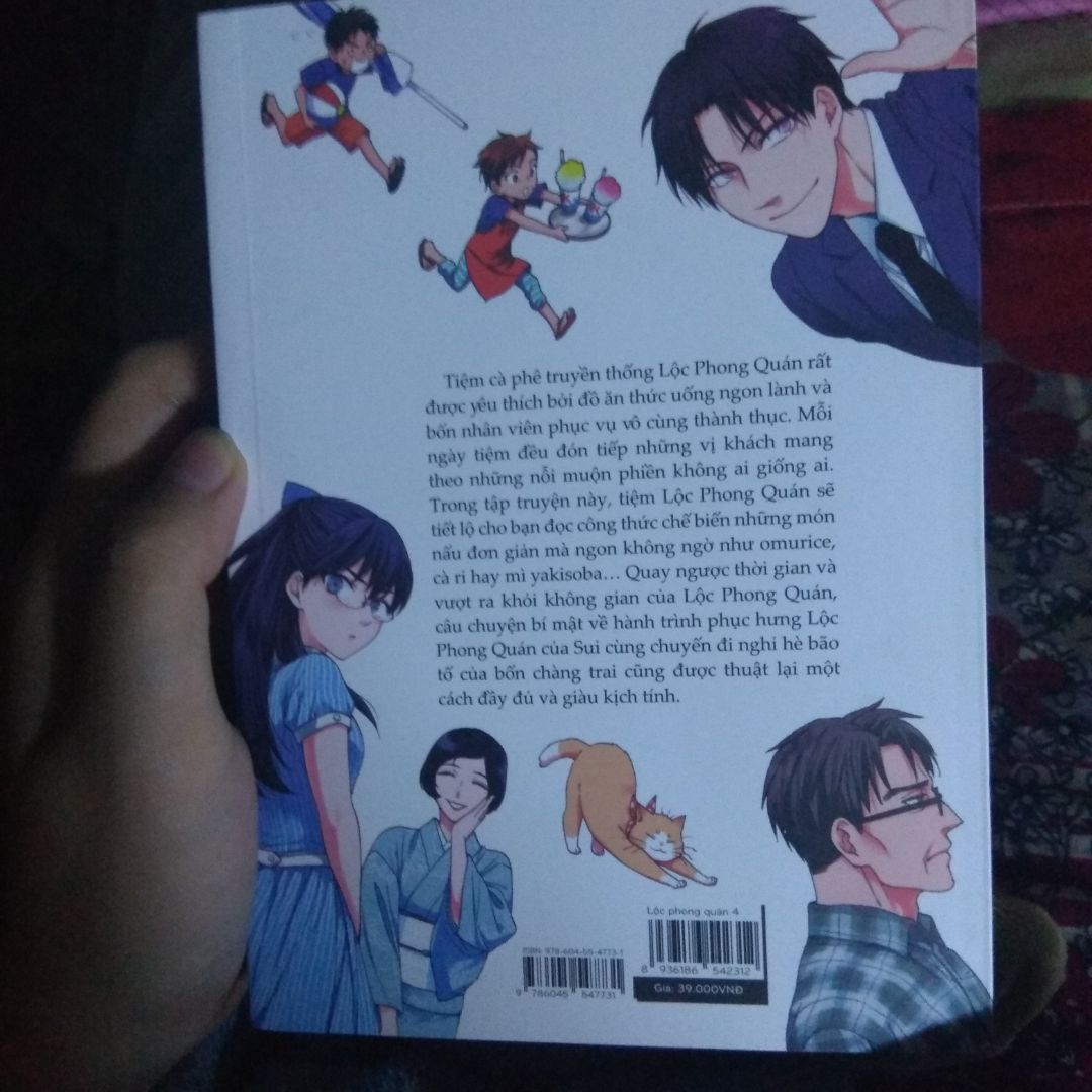 Những chàng trai ở Lộc Phong Quán – Vượt qua và bước tiếp Trong cuộc sống đầy những bộn bề và hối hả, sẽ có những thời điểm ta gặp phải những thách thức và khó khăn, buộc ta phải lựa chọn giữa lùi bước hay tiếp tục đương đầu. Sẽ có lúc ta phải cố gắng thoát ra khỏi những định kiến đã ăn sâu vào trong trí óc. Sẽ có lúc ta phải đối mặt với quá khứ và nỗi sợ hãi của bản thân. Sẽ có lúc ta phải tiếp nhận muôn vàn những thử thách mới. Sẽ có lúc ta phải đấu tranh với nỗi đau và nỗi cô đơn. Sẽ có lúc ta phải cố gắng vượt qua những do dự, lo lắng và hồi hộp. Tất cả những khó khăn và thử thách ấy, tất cả những nỗi vui buồn không ai giống ai ấy, bạn đọc sẽ lại được thấy trong tập thứ tư của bộ truyện “Những chàng trai ở Lộc Phong Quán”. Tập bốn mở đầu bằng những lời đồn về Lộc Phong Quán cùng với sự xuất hiện của Neneko, một cô bé không bao giờ tin vào những lời đồn và cho rằng những đánh giá ở trên mạng đều không đáng tin. Vậy là Gure lại có dịp được phô bày kỹ năng vẽ latte art điệu nghệ của mình. Bạn cũng sẽ được quay ngược thời gian, về lại quá khứ đầy bí mật của Sui để thấy được hành trình “hồi sinh” Lộc Phong Quán của anh. Tại đây, ta sẽ bắt gặp một hình ảnh khác của anh chàng chủ tiệm cuồng mèo ấy. Không chỉ quay ngược thời gian mà ở tập này, tác giả Shimizu Yuu còn cho chúng ta vượt ra khỏi không gian của Lộc Phong Quán để dõi theo kỳ nghỉ hè bên bờ biển đầy “bão táp” và vô cùng “kịch tính” của bốn chàng trai. Cởi bỏ chiếc kimono truyền thống, những anh chàng của chúng ta sẽ phải đối mặt với thử thách nào đây? Trở về Lộc Phong Quán, cửa tiệm lại tiếp đón một vị khách mới mang theo nỗi buồn và nỗi cô đơn sau khi vợ qua đời. Sau những tháng ngày một mình quanh quẩn trong căn nhà trống vắng, vị khách ấy đã quyết định ra ngoài thay đổi không khí và đặt chân tới cửa tiệm, vào đúng ngày Tokitaka phục vụ một món ăn bí mật không-có-trong-thực-đơn! Và một ngày nọ trong khi đi dạo phố, Sui và Tsubaki có ghé vào một tiệm cà phê nổi tiếng rồi gọi món bánh đặc biệt giới hạn theo mùa. Nào ngờ đâu, người làm ra món bánh ấy lại là Tsunozaki, để rồi sau đó Tsubaki phải đối mặt với một thử thách khiến cậu vô cùng lo lắng và hồi hộp. Cứ thế, những khó khăn muôn hình muôn trạng mà ta có thể gặp trong đời cứ lần lượt hiện ra qua từng trang truyện. Và những con người trong các câu chuyện ấy, nhờ ẩm thực và sẻ chia của bốn chàng trai ở Lộc Phong Quán đã tìm lại được niềm vui sống để vượt qua và bước tiếp trên chặng đường phía trước.
