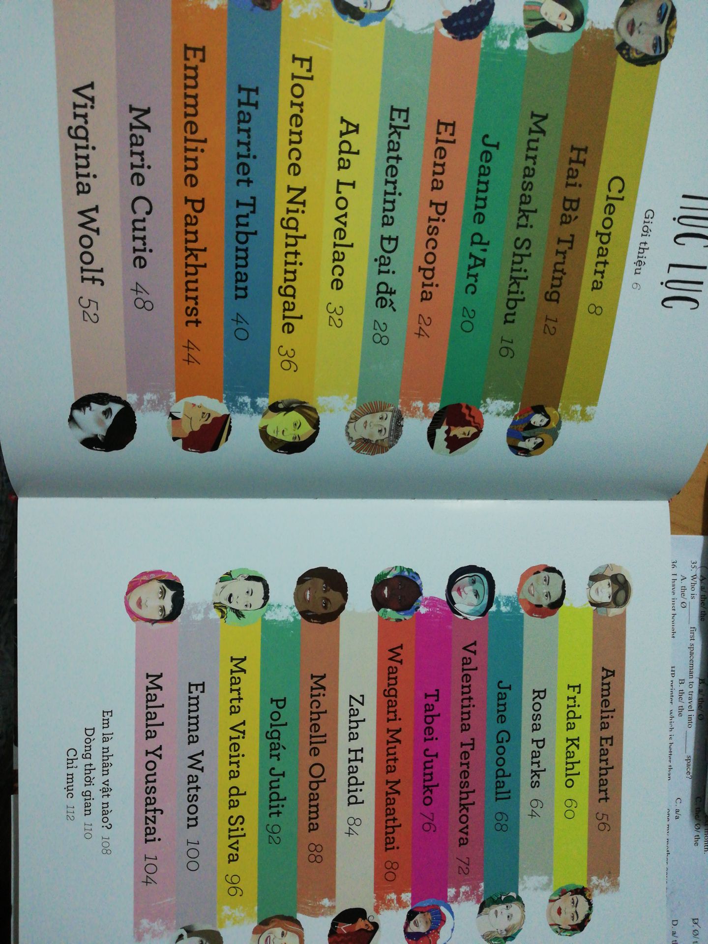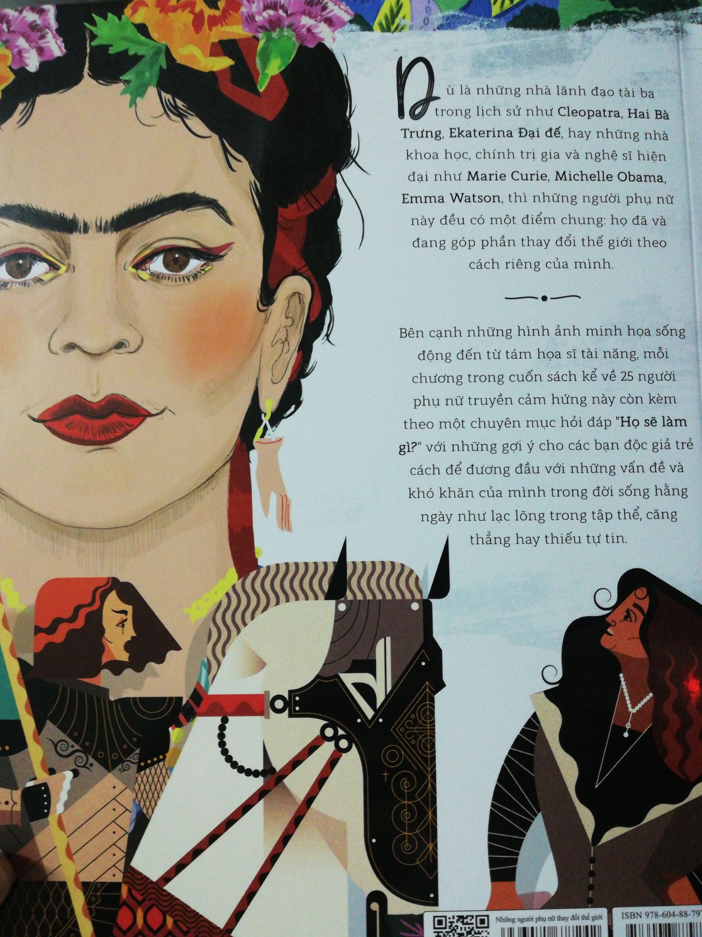 Dù là những nhà lãnh đạo tài ba trong lịch sử như Cleopatra, Hai Bà Trưng hay Ekaterina Đại đế, hay những nhà khoa học, chính trị gia và nghệ sĩ hiện đại như Marie Curie, Michelle Obama và Emma Watson, thì những người phụ nữ này đều có một điểm chung: họ đã và đang góp phần thay đổi thế giới theo cách riêng của mình. Bên cạnh những hình ảnh minh họa sống động đến từ tám họa sĩ tài năng, mỗi chương trong cuốn sách kể về 25 người phụ nữ truyền cảm hứng này còn kèm theo một chuyên mục hỏi đáp “Họ sẽ làm gì?” với những gợi ý cho các bạn độc giả trẻ cách để đương đầu với những vấn đề và khó khăn của mình trong đời sống hàng ngày như lạc lõng trong tập thể, căng thẳng hay thiếu tự tin. Độ tuổi khuyên đọc: 9+ Danh sách 25 người phụ nữ truyền cảm hứng: Cleopatra Hai Bà Trưng Murasaki Shikibu Jeanne d’Arc Elena Piscopia Ekaterina Đại đế Ada Lovelace Florence Nightingale Harriet Tubman Emmeline Pankhurst Marie Curie Virginia Woolf Amelia Earhart Frida Kahlo 60 Rosa Parks Jane Goodall Valentina Tereshkova Tabei Junko Wangari Muta Maathai Zaha Hadid Michelle Obama Polgár Judit Marta Vieira da Silva Emma Watson Malala Yousafzai