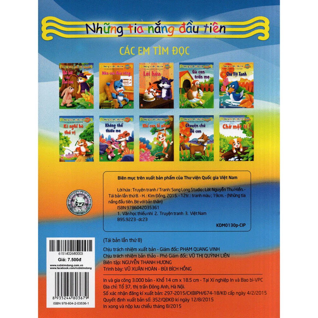 Công ty phát hành Nhà Xuất Bản Kim Đồng Tác giả Song Long Studio (tranh) – Nguyễn Thu Hiền (lời) Ngày xuất bản 09-2015 Kích thước 14 x 18.5 cm Nhà xuất bản Nhà Xuất Bản Kim Đồng Loại bìa Bìa mềm Số trang 12 Bộ sách Những tia nắng đầu tiên gồm những câu chuyện nhẹ nhàng, súc tích, ngộ nghĩnh, đáng yêu… giúp các bé của chúng ta học được nhiều điều hay, lẽ phải, biết kính trọng người trên, yêu quý gia đình, bè bạn. Những tia nắng đầu tiên: Lời hứa: Mẹ có làm một chiếc bánh và bảo 2 anh em mèo con không được ăn và chờ bố về. Mèo em cuối cùng vẫn không chịu nổi mà lén ăn một mẩu bánh. Sau khi mẹ hỏi thì mèo em đã nhận lỗi rồi 3 mẹ con mèo con cùng làm lại 1 chiếc bánh khác. Lời hứa – khi nói với trẻ con cũng rất khó hiểu. Cuốn sách nên đọc nhiều lần cho bé hiểu và bố mẹ cũng làm gương. Lời hứa với trẻ cũng rất quan trọng.
