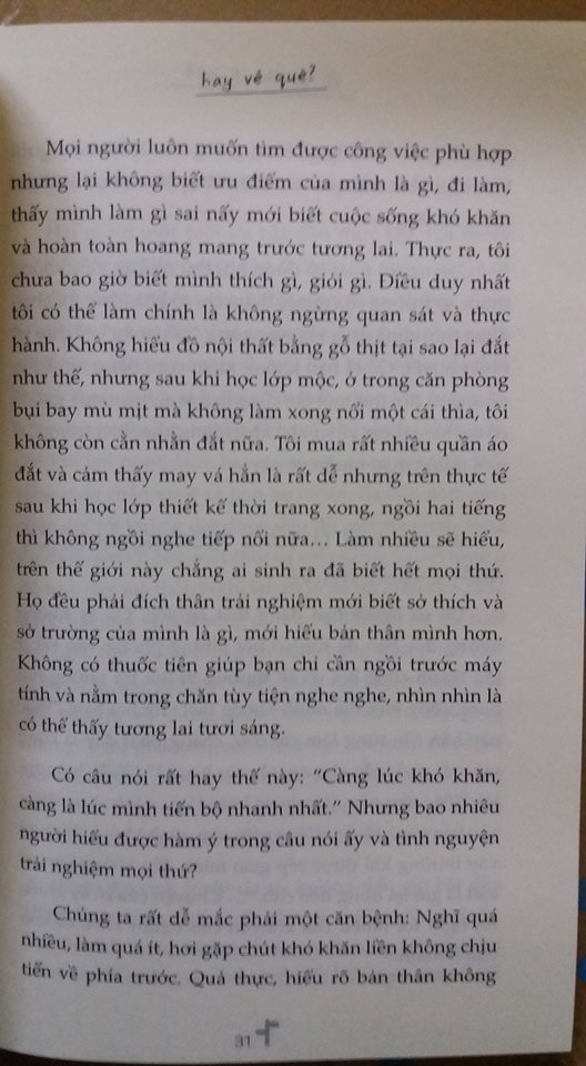 Ở lại thành phố hay về quê? Không ai vừa sinh ra đã mạnh mẽ, là người luôn chiến thắng trong cuộc đời; Đại bàng trước khi muốn tung cánh phải trải qua quá trình lột xác đau đớn; Ngọc muốn sáng phải năng mài dũa; Bạn bây giờ là chim đại bàng non, là ngọc thô; Đừng thỏa hiêp, đừng từ bỏ, đừng hoang mang; hãy tin vào tương lai, giữ vững niềm tin và tiến về phía ước mơ dù có phải đào đường lấp núi; Trong cuộc đời mỗi người, chúng ta luôn đứng trước những lựa chọn. Mỗi người trẻ trong quá trình trưởng thành luôn gặp rất nhiều khó khăn, sự bất an trong lựa chọn, sự không thấu hiểu của cha mẹ và cả nỗi cô đơn của những người độc thân… Nhiều người không biết có nên tiếp tục lang bạt ở thành phố lớn hay quay về quê nhà. Thực ra, dù sóng gió bão bùng hay sóng yên biển lặng đều chỉ là những sự lựa chọn khác nhau trong cuộc sống của mỗi người. Sự lựa chọn nằm trong tay bạn, mỗi người đều có quyền tự do lựa chọn cách sống thích hợp với mình nhất. Dù lựa chọn con đường nào thì ai cũng có lý do của riêng mình, điều quan trọng nhất là phải cố gắng, dũng cảm và kiên trì tới cùng. Để tìm được hướng đi thích hợp nhất, con người cần không ngừng thử sức. “Ở lại thành phố hay về quê ?” sẽ giúp bạn hiểu, đại bàng trước khi muốn tung cánh phải trải qua quá trình lột xác đau đớn. Bạn sẽ tìm thấy những câu chuyện về những con người đang từng giây từng phút nỗ lực để cải thiện cuộc sống; những chia sẻ chân thành sẽ chạm đến trái tim bạn, giúp bạn vơi đi nỗi sợ và có thêm can đảm để đối diện với khó khăn thử thách. Một cuốn sách hay không chỉ chạm đến trái tim, mà còn soi sáng tâm trí, mở ra những con đường cho bạn đọc. Tác giả Mèo Maverick nói rằng: “Đừng để bạn ở tương lai ghét bạn ở hiện tại”. Cuốn sách sẽ cho chúng ta hiểu được rằng “Ở lại thành phố” hay “về quê” không phải là một lựa chọn. Lựa chọn duy nhất của bạn là nỗ lực không ngừng nghỉ. Hãy dũng cảm đối mặt với những khó khăn, thoát khỏi vỏ bọc và trở thành những chú đại bàng đầy kiêu hãnh. Đôi khi bước chân ra không đơn giản chỉ là tìm cơ hội mới, mà quan trọng hơn là xây dựng niềm tin cho chính cuộc đời mình. Cuốn sách dành cho những bạn trẻ đang băn khoăn trước ngưỡng cửa cuộc đời, dành cho những con người luôn khao khát vươn cao, luôn ước mơ về một cuộc sống tốt đẹp hơn và sẵn sàng cháy hết mình vì ước mơ đó.