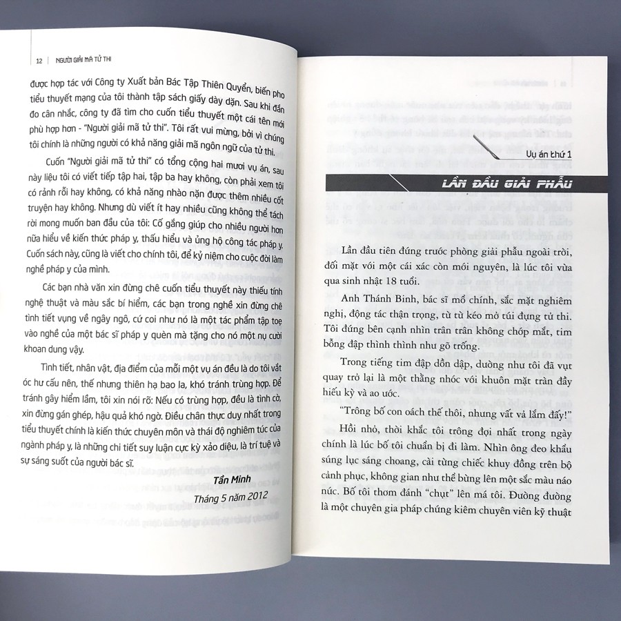 Pháp y Tần Minh (bộ 3 tập) ~~~~ “Muốn cho người khác không biết, trừ phi mình đừng làm.” Lời tuyên chiến của bác sĩ pháp y với kẻ phạm tội Tội phạm cho rằng cái chết của nạn nhân sẽ che giấu được tội lỗi của chúng, nhưng nhờ có họ, những người giải mã tử thi, tội ác không bao giờ có thể tàng hình. Những vụ án mạng rùng rợn nhất, những vụ điều tra phá án ly kỳ nhất được bật mí qua trải nghiệm có thực của một bác sĩ pháp y. ====== Sự xuất hện của bộ ba phá án: Tần Minh – bác sĩ pháp y cực ngầu, Lâm Đào – chuyên gia pháp chứng soái ca, Đại Bảo – pháp y “sách vở” sẽ đem lại những mẩu chuyện thú vị, hóm hỉnh bên cạnh những vụ phá án ngày một căng thẳng, ly kỳ. Trọn bộ gồm 3 tập: – Tập 1: Người giải mã tử thi – Tập 2: Lời tố cáo lặng thầm – Tập 3: Ngón tay thứ mười một ===== Công ty phát hành Huy Hoàng Bookstore Nhà xuất bản NXB Văn Học Tác giả Tần Minh Ngày xuất bản 03-2018 Kích thước 13.5 x 20.5 cm Số trang 1780 trang/ Bộ 3 quyển Loại bìa Bìa mềm ===== #sách , #sáchvănhọc-tiểuthuyết, #lightnovel, #diệplạcvôtâm, #bts, #bạnđắtgiábaonhiêu, #sáchbts, #sáchđammỹ, #sáchhay, #nhàsáchonline