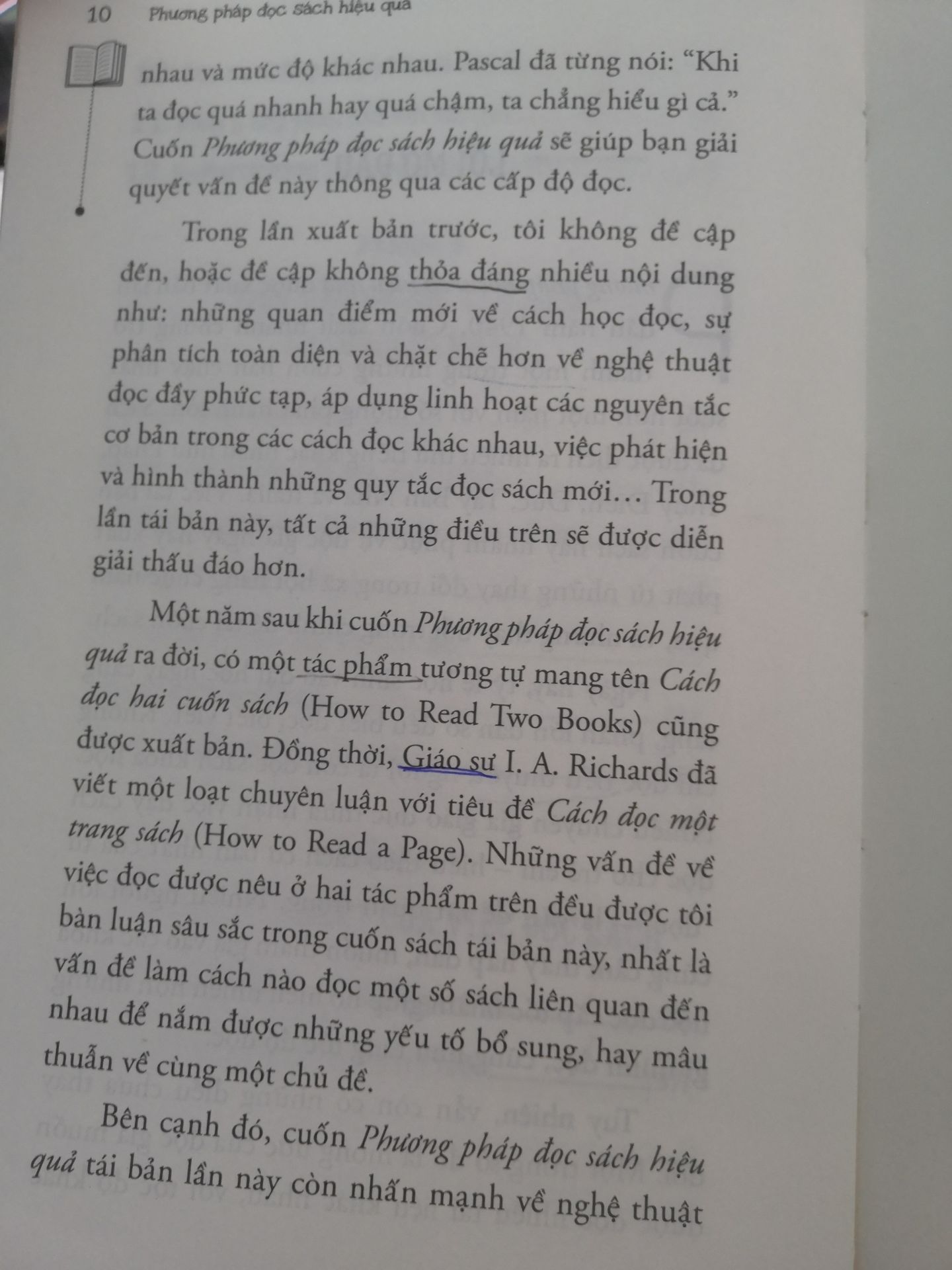 Phương Pháp Đọc Sách Hiệu Quả (Tái Bản 2018) Đọc sách như một nghệ thuật, ngay từ lần xuất bản đầu tiên năm 1940, đã được đánh giá là cuốn sách hướng dẫn đọc hiểu lý thú và hiệu quả nhất dành cho độc giả phổ thông. Cuốn sách đã nhanh chóng trở thành một tác phẩm kinh điển về cách đọc sách thông minh. Đọc sách như một nghệ thuật giúp bạn khám phá và lĩnh hội các cấp độ đọc khác nhau, từ đọc sơ cấp, đọc lướt có hệ thống đến đọc kiểm soát và đọc siêu tốc. Bạn có thể áp dụng các cấp độ này cho việc phân loại, chụp X-quang hay phê bình sách, tuỳ theo nhu cầu và mục đích của mình. Nhờ các kỹ năng đọc được hệ thống ở đây, bạn sẽ biết cách tiếp cận và nắm bắt tất cả các loại văn bản, dù đó là sách thực hành, khoa học, toán học, triết học, lịch sử hay các tác phẩm văn học. Đọc sách như một nghệ thuật, hơn hết, thúc đẩy ta trở thành độc giả say mê. Cuốn sách là người bạn đường không thể thiếu của mỗi người trên hành trình đối thoại để học hỏi, khám phá, tu thân và trưởng thành, như Decartes đã nói: “Đọc sách là được trò chuyện với những người thành đạt nhất của các thế kỷ đã qua”.