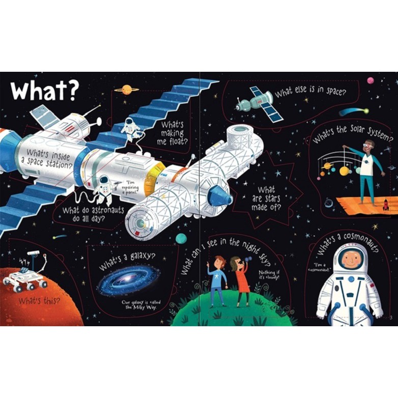 1. Nội dung Sách – Questions and Answers Space Với hơn 60 tấm lật giở, Questions and Answers About Space sẽ mở ra cho các bé những kiến thức vô cùng thú vị về Không gian, Vũ Trụ: – Các phi hành gia sẽ sống ở đâu trong Không gian? – Tại sao chúng ta không thể nhìn thấy các vì sao vào ban ngày? – Dải ngân hà là gì? Có bao nhiêu hành tinh? Sách có lượng thông tin cô đọng, súc tích nhưng mang tính chuyên môn chuẩn xác, thích hợp cho các bé khám phá kiến thức khoa học nền tảng Sách nhập hoàn toàn từ UK nên cha mẹ yên tâm về chất lượng sách. 2. Thông tin Sách – Questions and Answers Space Độ tuổi 5+ Sách bìa cứng ISBN: 9781409598992 Số trang 16 trang Kích thước: 276 x 216mm Nhà xuất bản Usborne Năm xuất bản 2017