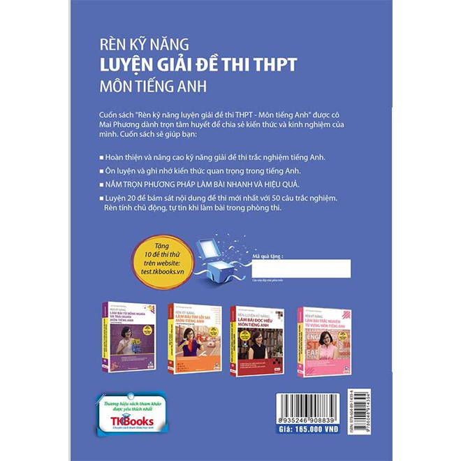 Công ty phát hành TKBooks Tác giả Vũ Thị Mai Phương Ngày xuất bản 02-2017 Kích thước 17 x 24 cm Nhà xuất bản Nhà Xuất Bản Hồng Đức Loại bìa Bìa mềm Số trang 478 GIỚI THIỆU SÁCH Rèn Kỹ Năng Luyện Giải Đề Thi THPT Môn Tiếng Anh Cuốn sách bao gồm 20 đề thi chuẩn kiến thức và kĩ năng đối với học sinh bậc THPT được đúc kết từ kinh nghiệm giảng dạy của cô Mai Phương. Đặc biệt, sau mỗi đề đều được cung cấp đáp án và lời giải, từ mới hết sức chi tiết giúp các bạn học sinh dễ dàng kiểm tra đáp án, tìm ra lỗi sai và khắc phục, bổ sung kiến thức. Ngay cả các bài khóa cũng sẽ được dịch và giải thích cụ thể đến từng câu, từng ý giúp cho người đọc hiểu cặn kẽ và ghi nhớ lâu từng bài khóa. Với nội dung phong phú, kiến thức hữu ích, chắc chắn đây sẽ là một tài liệu hữu ích phục vụ cho việc ôn thi THPT môn tiếng Anh của các bạn học sinh.