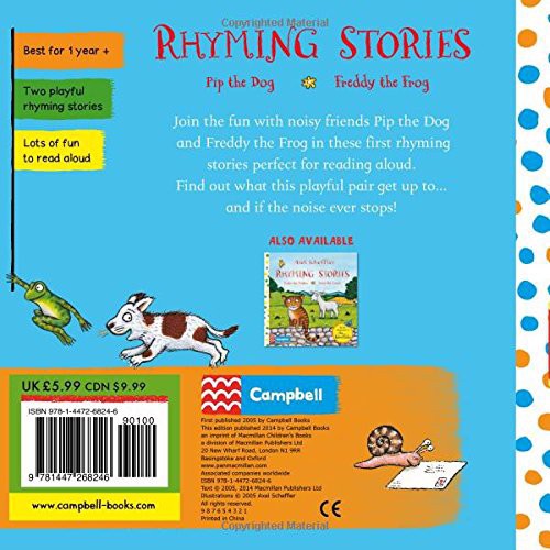 1. Giới thiệu Sách – Rhyming Stories: Pip the Dog and Freddy the Frog RHYMING STORIES: Pip the Dog and Freddy the Frog là một trong những cuốn sách đáng yêu PDF EPUB PRC AZW miễn phí đọc trên điện thoại – máy tính, ứng dụng đọc file epub, prc reader, azw reader của tác giả truyện thiếu nhi nổi tiếng trên toàn thế giới Axel Scheffler Sách bao gồm đến hai câu chuyện theo dạng thức Rhyming Stories – những câu chuyện có vần điệu lặp đi lặp lại, thích hợp cho các bé mới tập làm quen với thể loại truyện tranh có tình tiết, giúp phát huy khả năng ngôn ngữ Các bé sẽ làm quen với hai bạn chó Pip và Ếch Freddy – hai người bạn luôn nhộn nhạo, náo nhiệt và đáng yêu. Bạn Pip thì thích rượt bạn mèo, còn Ếch ta thì lại thích bắt ruồi. Cứ thế nhịp điệu câu chữ vang lên vui nhộn, khiến các bạn nhỏ vô cùng yêu thích 2. Thông số Sách – Rhyming Stories: Pip the Dog and Freddy the Frog Độ tuổi: 2+ Sách giấy cứng Số trang 20 Nhà xuất bản: Macmillan Năm xuất bản 2019 ISBN-10: 1447268245 ISBN-13: 978-1447268246 Kích thước: 177.8 x 15.24 x 177.8 mm