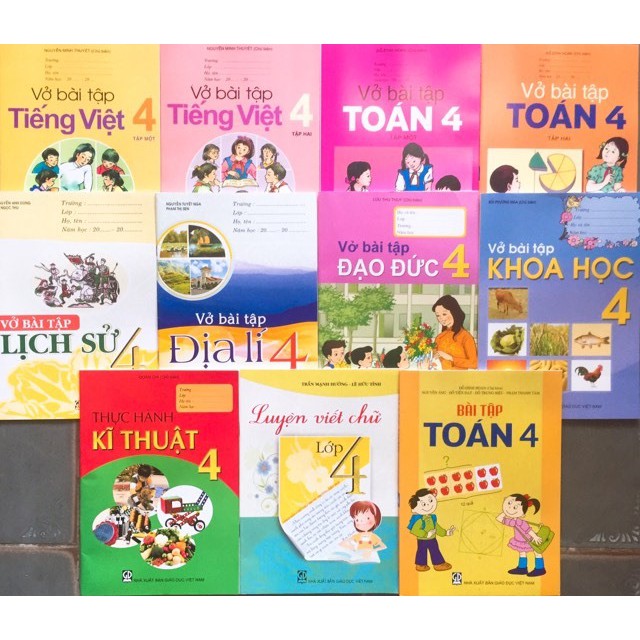 SÁCH GIAO KHOA VÀ SÁCH BÀI TẬP LỚP 4 NĂM HỌC 2020-2021 GỒM 19 CUỐN: – Khổ: 17 x 24cm – Nhà xuất bản: Nhà Xuất Bản Giáo Dục Việt Nam – Tác Giả: Nhiều Tác Giả – Năm xuất bản: 2020 – Tái Bản: Lần thứ 17 – Bìa mềm 1. Tiếng Việt lớp 4 – tập 1 …………………………….……….. 15.000 đồng 2. Tiếng Việt lớp 4 – tập 2 ……………………………….…….. 14.000 đồng 3. Toán lớp 4 ……………………………………………..…….. 13.000 đồng 4. Khoa Học Lớp 4 ………………………………………..……. 12.000 đồng 5. Lịch Sử và Địa Lý lớp 4 ……………………………….……. 13.000 đồng 6. Âm Nhạc lớp 4 ……………………………………………..… 4.000 đồng 7. Đạo Đức lớp 4 …………………………………….….……… 4.000 đồng 8. Kỹ Thuật lớp 4 ……….……………………………………….. 5.000 đồng 9. Vở Bài tập Tiếng việt lớp 4 – Tập 1 ……….…………….….. 12.000 đồng 10. Vở Bài tập Tiếng việt lớp 4 – Tập 2 ……….……..……….. 10.200 đồng 11. Vở Bài tập Toán lớp 4 – tập 1 ……….…………….……….. 9.900 đồng 12. Vở Bài tập Toán lớp 4 – tập 2 ……………..……………….. 11.700 đồng 13. Vở Bài tập Khoa học lớp 4 …………….………………….. 8.100 đồng 14. Vở Bài tập Lịch sử lớp 4 ……………………………….…. 5.400 đồng 15. Vở Bài tập Đạo đức lớp 4 ……….…………………….….. 5.400 đồng 16. Thực Hành Kỹ Thuật lớp 4 …………………….………….. 6.000 đồng 17. Vở Bài tập Địa lý lớp 4 …………………………………….. 6.600 đồng 18. Luyện viết chữ 4……………………………………………………….5.400 đồng 19. Bài tập toán 4 …………………………………………………………11.700 đồng