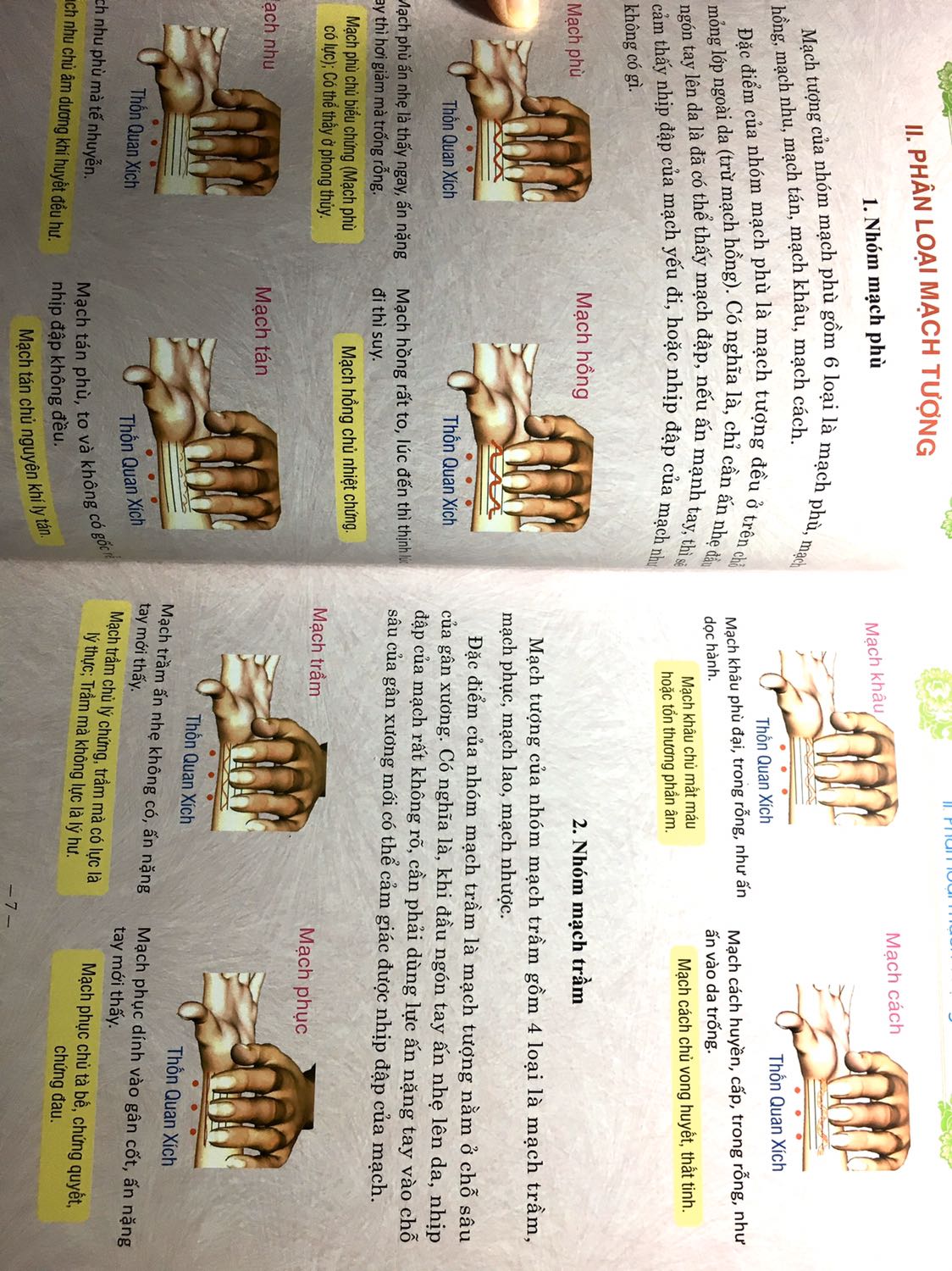 Sổ Tay Mạch Chuẩn ” – bao gồm : 1. Chủ bệnh và đặc trưng 2. Phân loại mạch tượng 3. Mạch phù 4. Mạch hồng 5. Mạch nhu 6. Mạch tán 7. Mạch khâu (khổng) 8. Mạch cách 9. Mạch trầm 10. Mạch phục