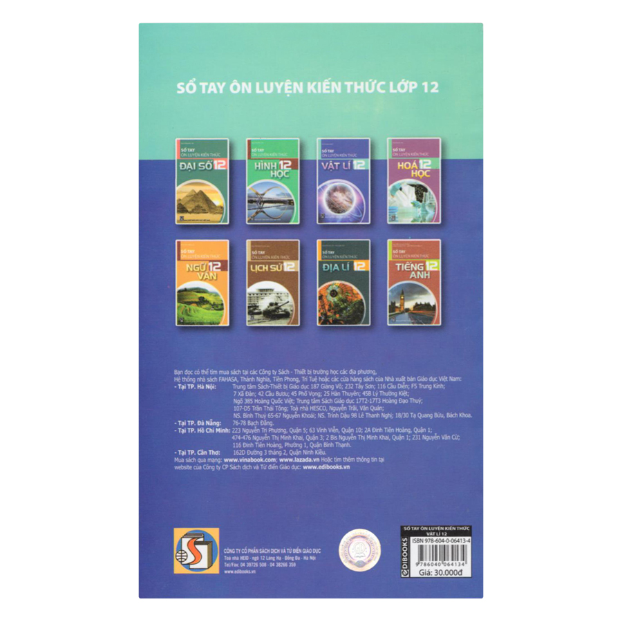 Sách Sổ Tay Ôn Luyện Kiến Thức Vật Lý 12, , Công ty phát hành Edibooks Ngày xuất bản 07-2015 Kích thước 11 x 18 cm Loại bìa Bìa mềm Số trang 212 SKU 2488708968200 Nhà xuất bản Nhà Xuất Bản Giáo Dục Việt Nam.
