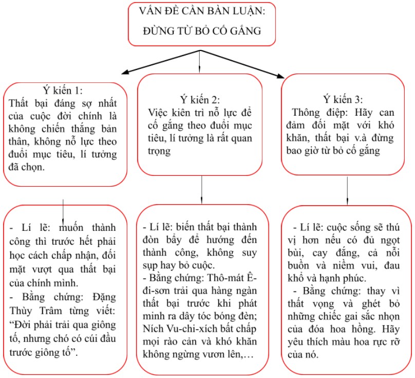 | Trình bày những lí lẽ, bằng chứng để thuyết phục người đọc, người nghe. | – Lí lẽ: muốn thành công thì trước hết phải học cách chấp nhận, đối mặt vượt qua thất bại của chính mình. – Bằng chứng: Đặng Thùy Trâm từng viết: “Đời phải trải qua giông tố, nhưng chó có cúi đầu trước giông tố”. – Lí lẽ: biến thất bại thành đòn bẩy để hướng đến thành công, không suy sụp hay bỏ cuộc. – Bằng chứng: Thô-mát Ê-đi-sơn trải qua hàng ngàn thất bại trước khi phát minh ra dây tóc bóng đèn; Ních Vu-chi-xích bất chấp mọi rào cản và khó khăn không ngừng vươn lên,… – Lí lẽ: cuộc sống sẽ thú vị hơn nếu có đủ ngọt bùi, cay đắng, cả nỗi buồn và niềm vui, đau khổ và hạnh phúc. – Bằng chứng: thay vì thất vọng và ghét bỏ những chiếc gai sắc nhọn của đóa hoa hồng. Hãy yêu thích màu hoa rực rỡ của nó. |