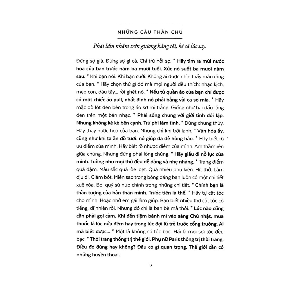Công ty phát hành Nhã Nam Tác giả Sophie Mas – Anne Berest – Audrey Diwan – Caroline de Maigret Ngày xuất bản 04-2016 Kích thước 14 x 20.5 cm Nhà xuất bản Nhà Xuất Bản Thế Giới Loại bìa Bìa mềm Số trang 271 GIỚI THIỆU SÁCH Sống Như Người Paris Những cô gái Paris luôn có điều gì thật bí ẩn, với vẻ duyên dáng và nhẹ nhõm chết người của họ. Bạn đã nhận ra điều đó từ lâu, nhưng không thể cắt nghĩa vì sao! Ở đây, trong cuốn sách này, đích thân phụ nữ Paris sẽ đưa ra định nghĩa về… chính họ, và cho ta biết thế nào là một quý cô Paris xét trên mọi mặt: văn hóa, thời trang và thái độ…